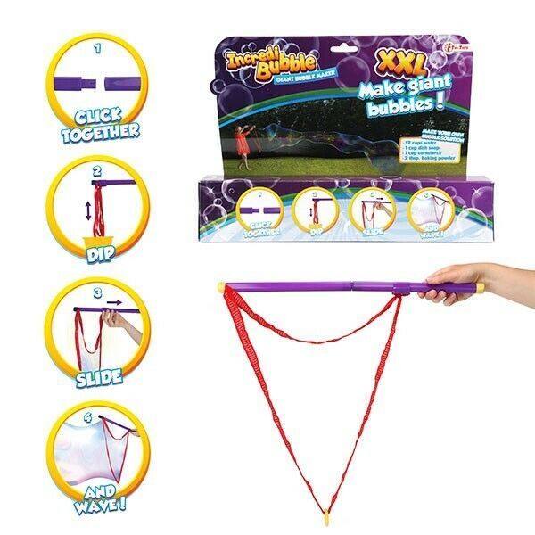 XXL - Seifenblaser-Macher Set mit 1l Seifenblasenwasser Beschreibung Mache riesige Seifenblasen selber - mit dem XXL Giant Bubble Maker im Set mit 1l Seifenblasenflüssigkeit. Einfach das ca. 190cm lange Spezialband in die im Lieferumfang enthaltene Seifenblasenlösung dippen, Schnur am Stab auseinand