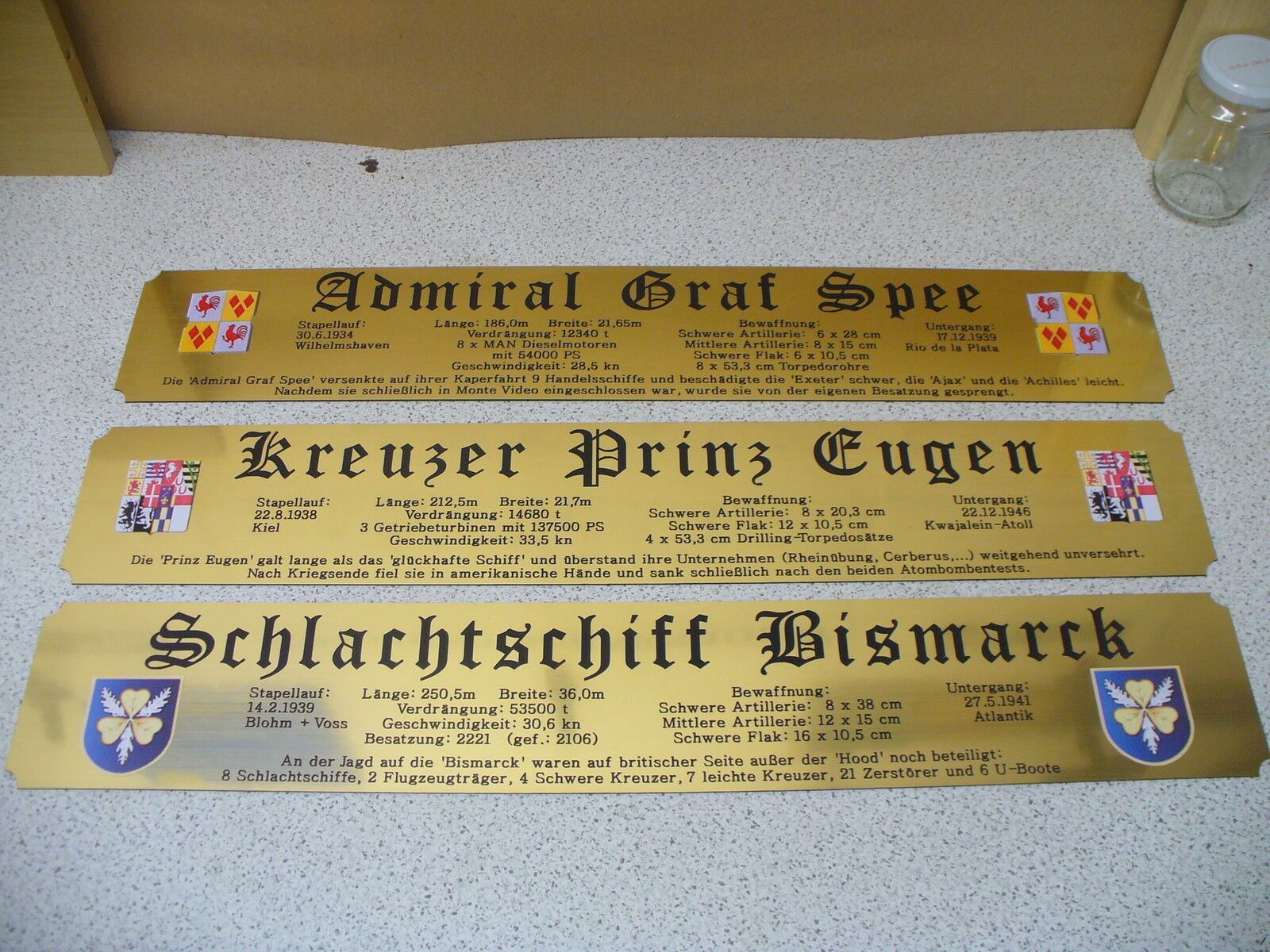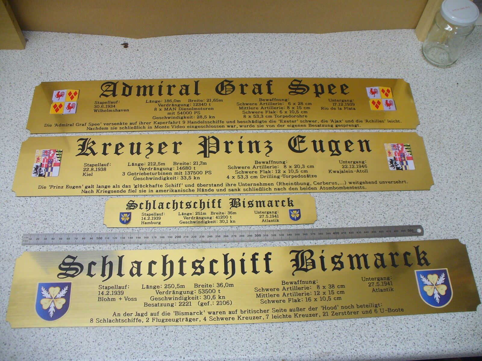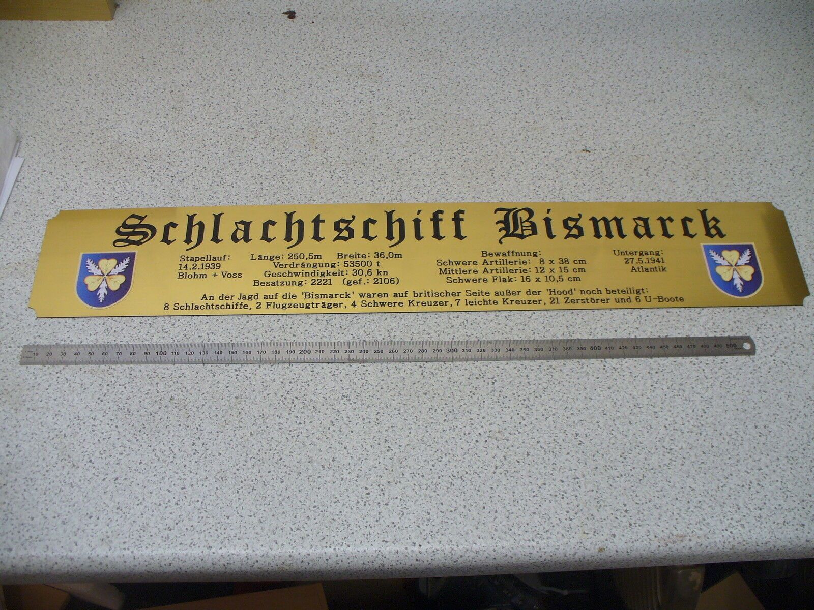 Sie bieten hier auf: 1 exclusives Namensschild für Großmodell - U 96 - mit farbigem Schiffswappen und ausführlichen verschiedenen Daten (siehe Bilder) goldfarbig mit schwarzem Schriftzug (auch in weiss - oder silberfarbig möglich --> dann bitte angeben) Abmessung: 575 x 97 x 1,5 mm Das Schild ist