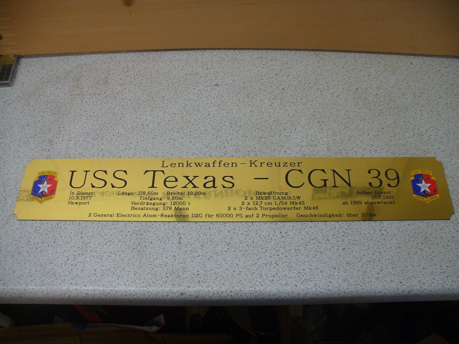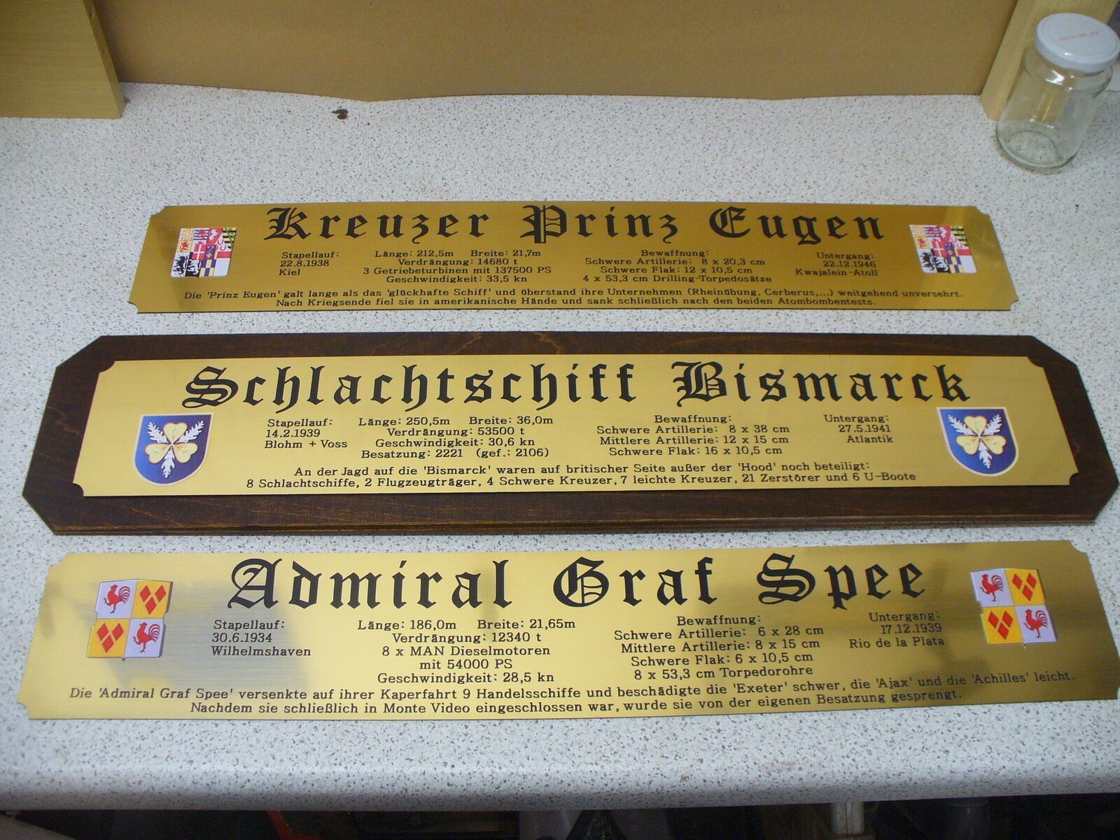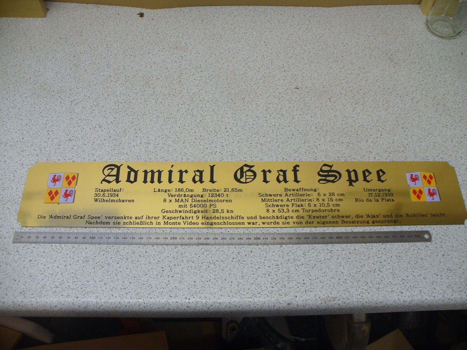 Sie bieten hier auf: 1 exclusives Namensschild für Großmodell - U 96 - mit farbigem Schiffswappen und ausführlichen verschiedenen Daten (siehe Bilder) goldfarbig mit schwarzem Schriftzug (auch in weiss - oder silberfarbig möglich --> dann bitte angeben) Abmessung: 575 x 97 x 1,5 mm Das Schild ist