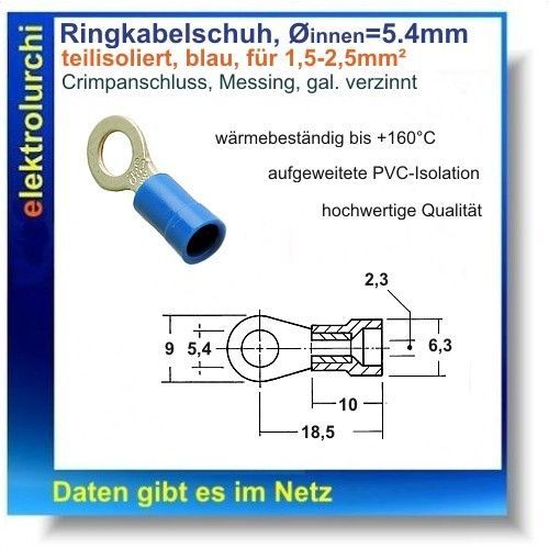 Sie bieten auf folgenden Artikel 20 Stück Ringkabelschuh 1,5 -2,5mm² qmm mit Teilisolierung, blau, innen 5,4mm aus Elektrolytkupfer, verzinnt, Isolierhülse: PA, halogenfrei, mit Crimpanschluss max. Kabelquerschnitt: 1,5 -2,5 mm² Kontaktmaterial: Kupfer (verzinnt) Gesamtlänge: 18,5mm Lochdurchmesser: