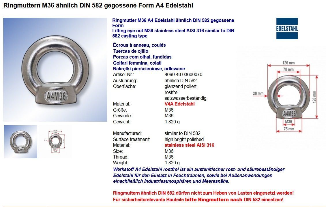 Ringmuttern M36 ähnlich DIN 582 gegossene Form A4 Edelstahl Ringmutter M36 A4 Edelstahl ähnlich DIN 582 gegossene Form Lifting eye nut M36 stainless steel AISI 316 similar to DIN 582 casting type Écrous à anneau, coulés Tuercas de ojillo Porcas com olhal, fundidas Golfari femmin