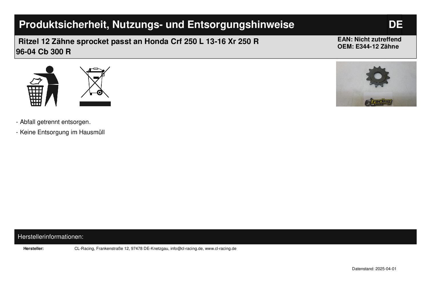 Ritzel 12 Zähne sprocket passt an Honda Crf 250 L 13-16 Xr 250 R 96-04 Cb 300 R