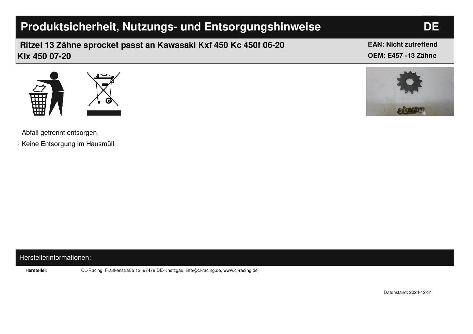 Ritzel 13 Zähne sprocket passt an Kawasaki Kxf 450 Kc 450f 06-20 Klx 450 07-20