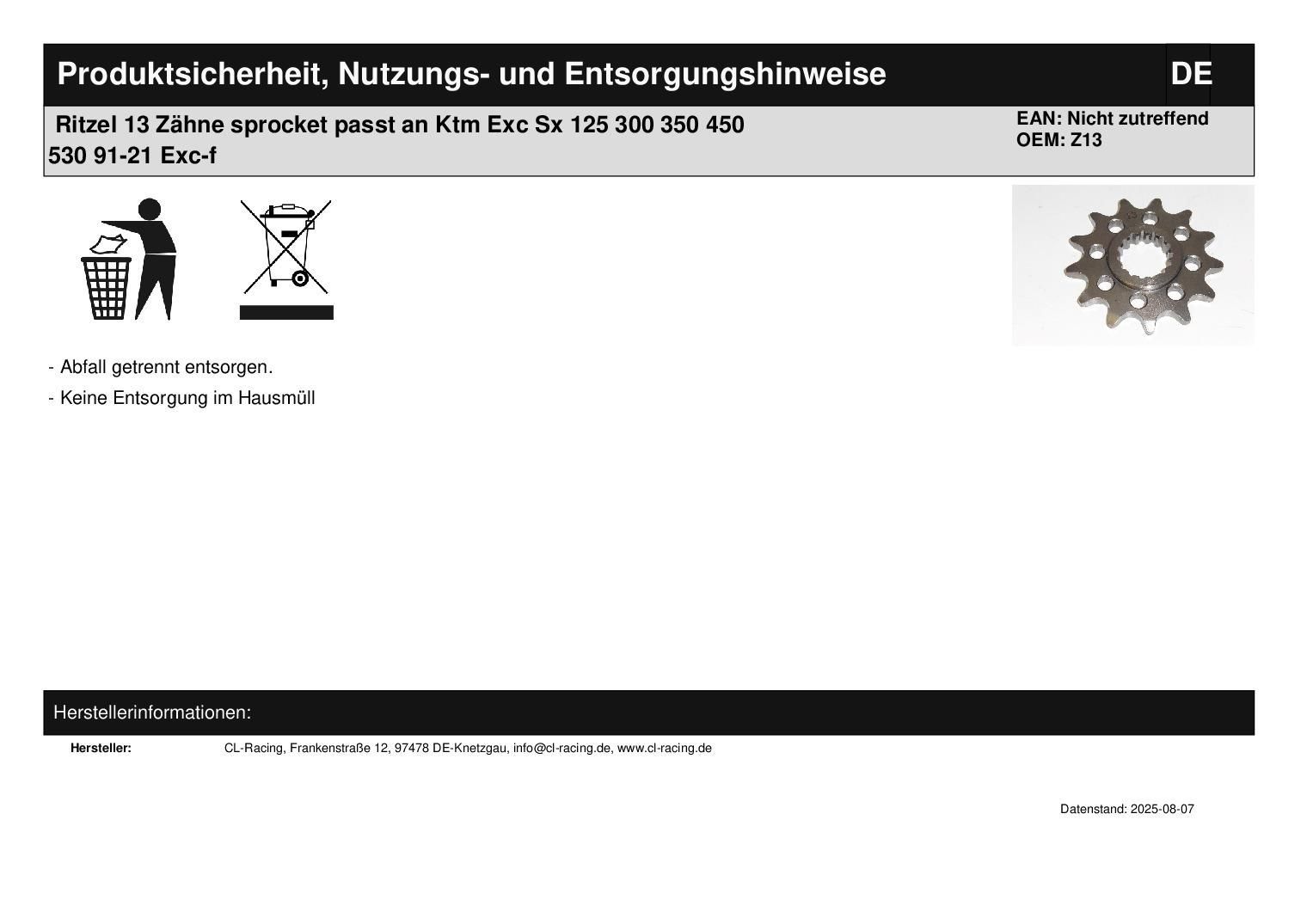 Ritzel 13 Zähne sprocket passt an Ktm Exc Sx 125 300 350 450 530 91-21 Exc-f
