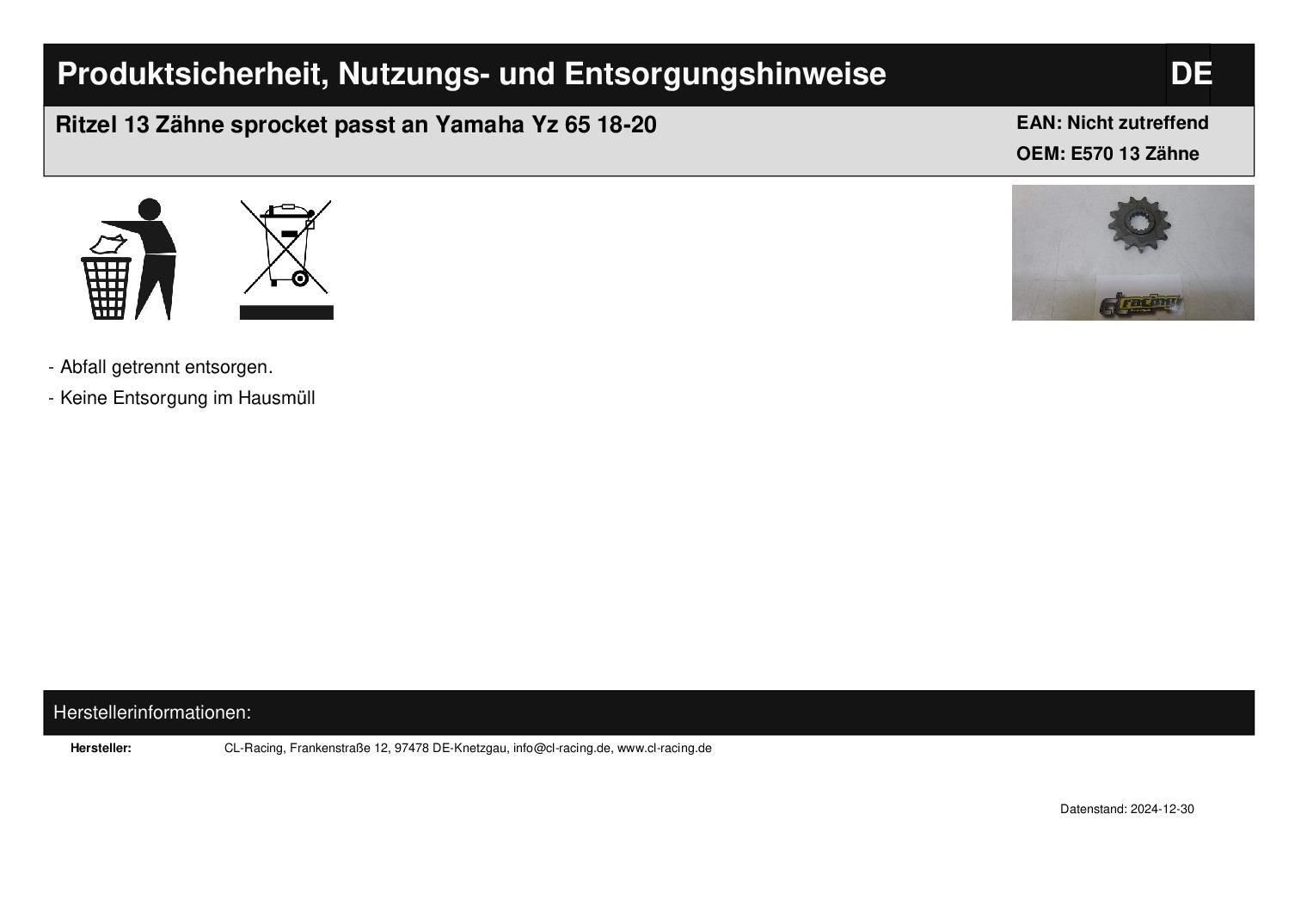 Ritzel 13 Zähne sprocket passt an Yamaha Yz 65 18-20