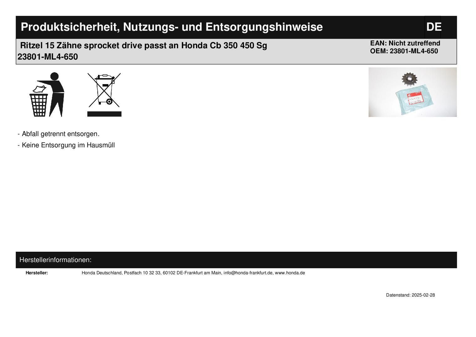 Ritzel 15 Zähne sprocket drive passt an Honda Cb 350 450 Sg 23801-ML4-650