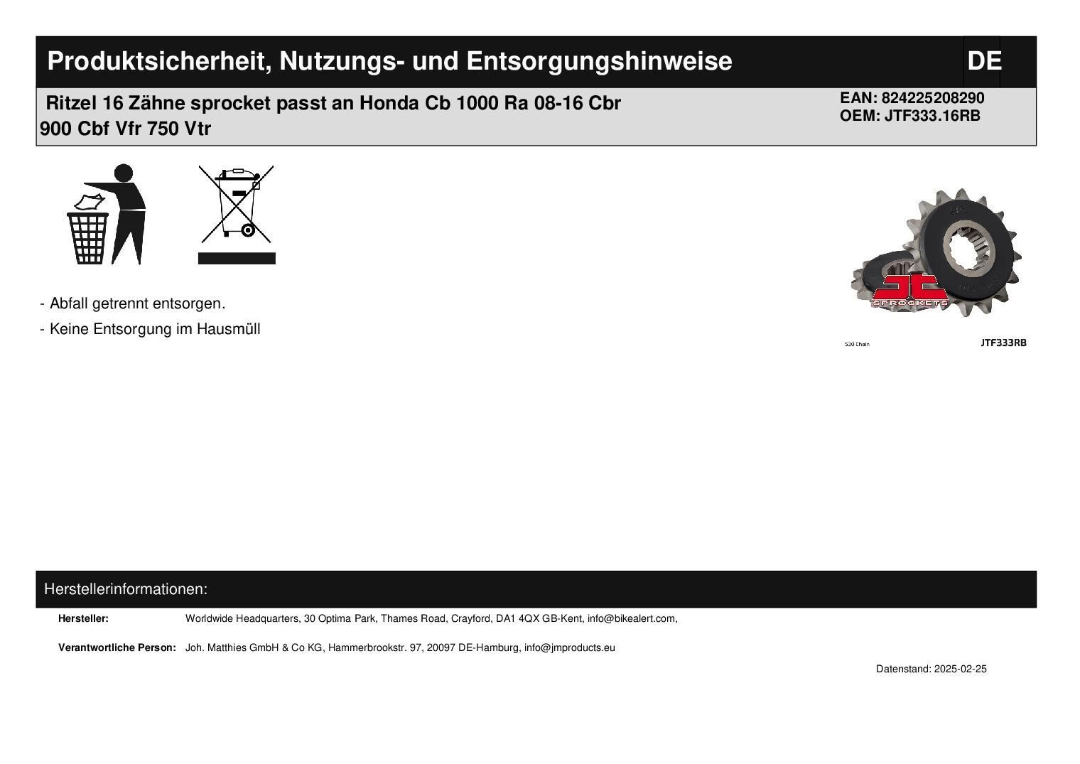 Ritzel 16 Zähne sprocket passt an Honda Cb 1000 Ra 08-16 Cbr 900 Cbf Vfr 750 Vtr