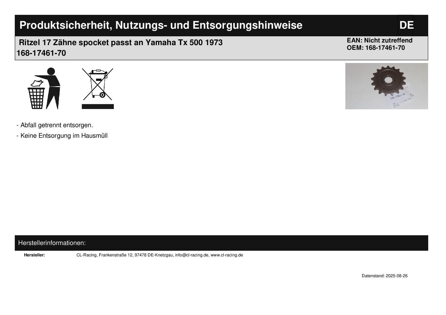 Ritzel 17 Zähne spocket passt an Yamaha Tx 500 1973 168-17461-70