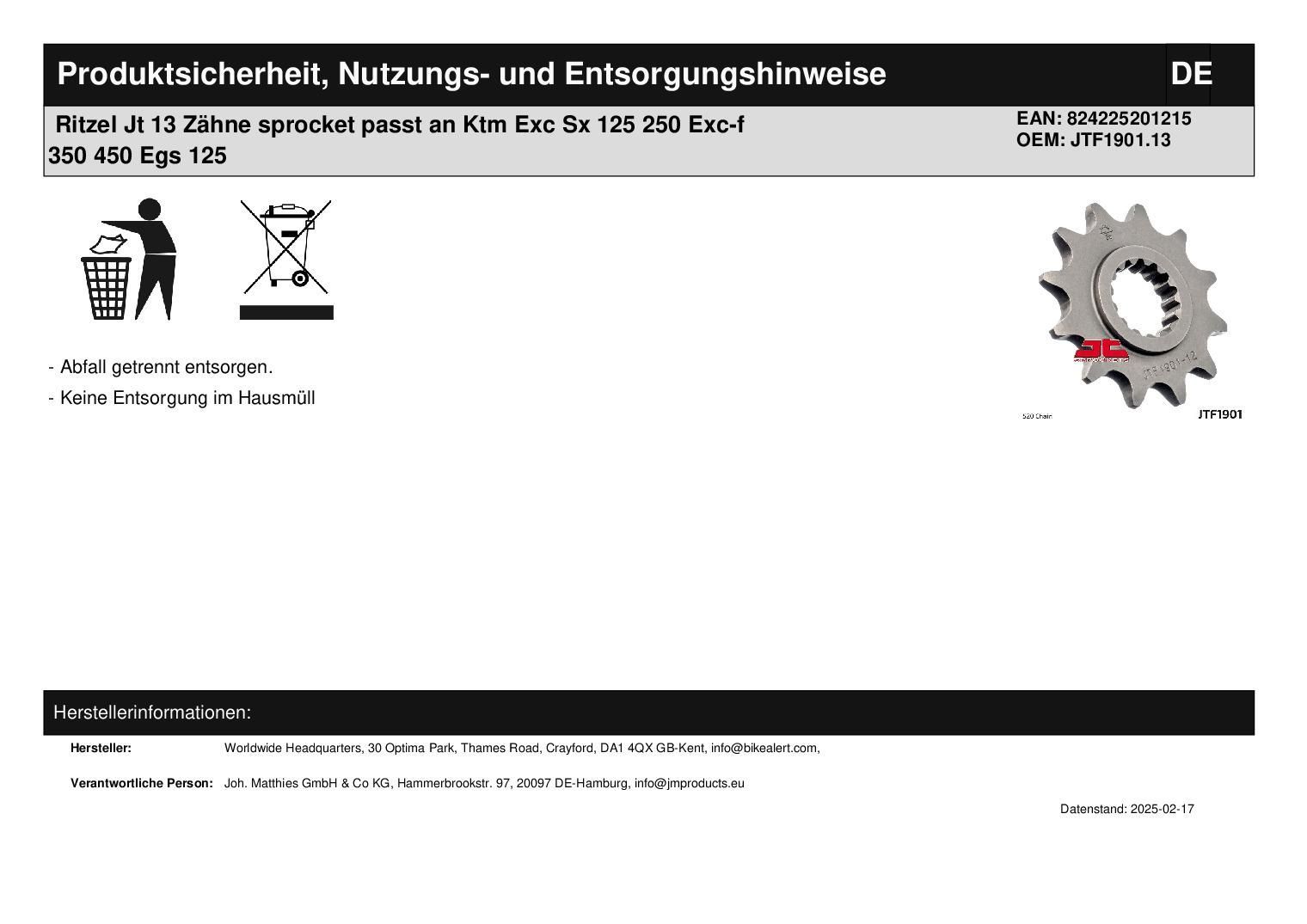 Ritzel Jt 13 Zähne sprocket passt an Ktm Exc Sx 125 250 Exc-f 350 450 Egs 125