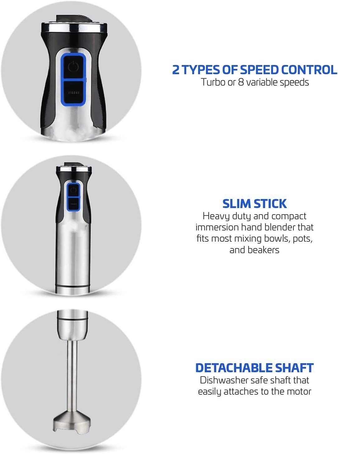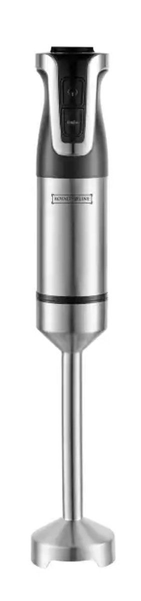 Royalty Line RL-ESTM800 Stabmixer: 800 W Leistung mit robustem Edelstahlgehäuse und -klingen. Stufenlose Geschwindigkeitsregelung plus Turbomodus für harte Zutaten. Ergonomischer, rutschfester Griff und hygienischer Edelstahl-Zerkleinerungsaufsatz. Abnehmbare, leicht zu reinigende Teile. Ideal für Suppen, Saucen, Smoothies und Babynahrung. Kompaktes Design, gut als Geschenk verpackt.