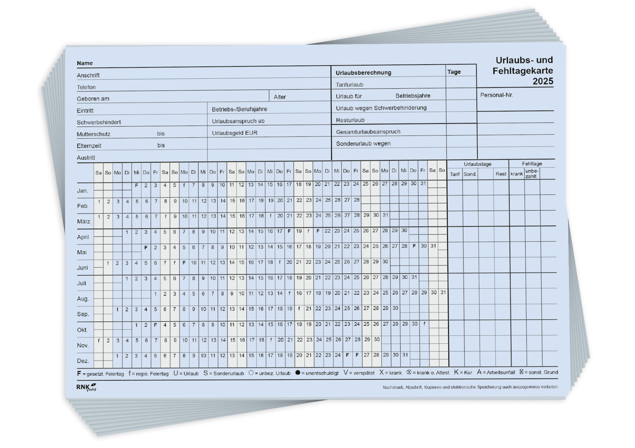 RNK 2901/25-10 Urlaubs- und Fehltagekarte mit Wochentage-Einteilung 2025, 210 x