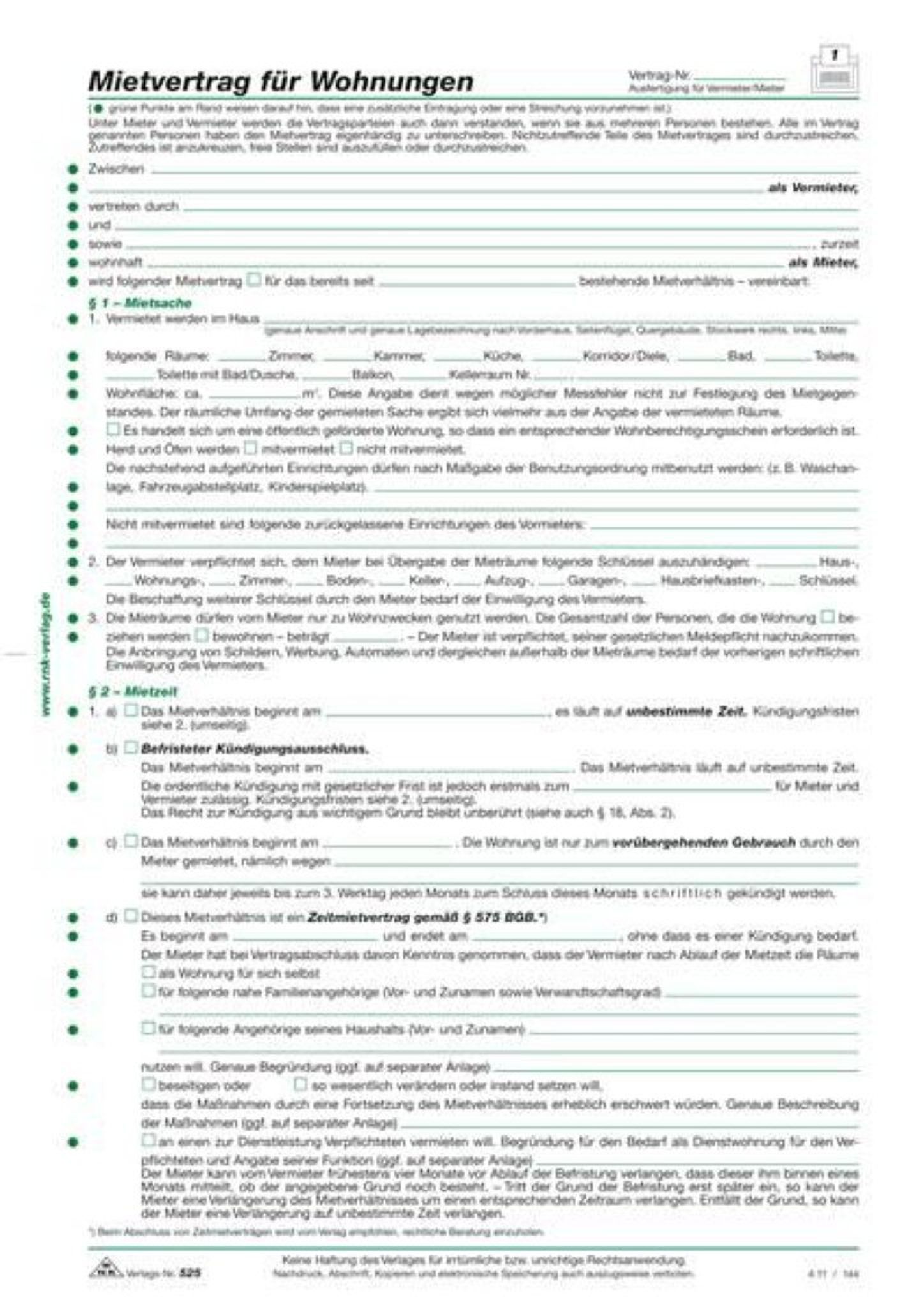 RNK Mietvertrag Wohnung DIN A4 8 Seiten 10St