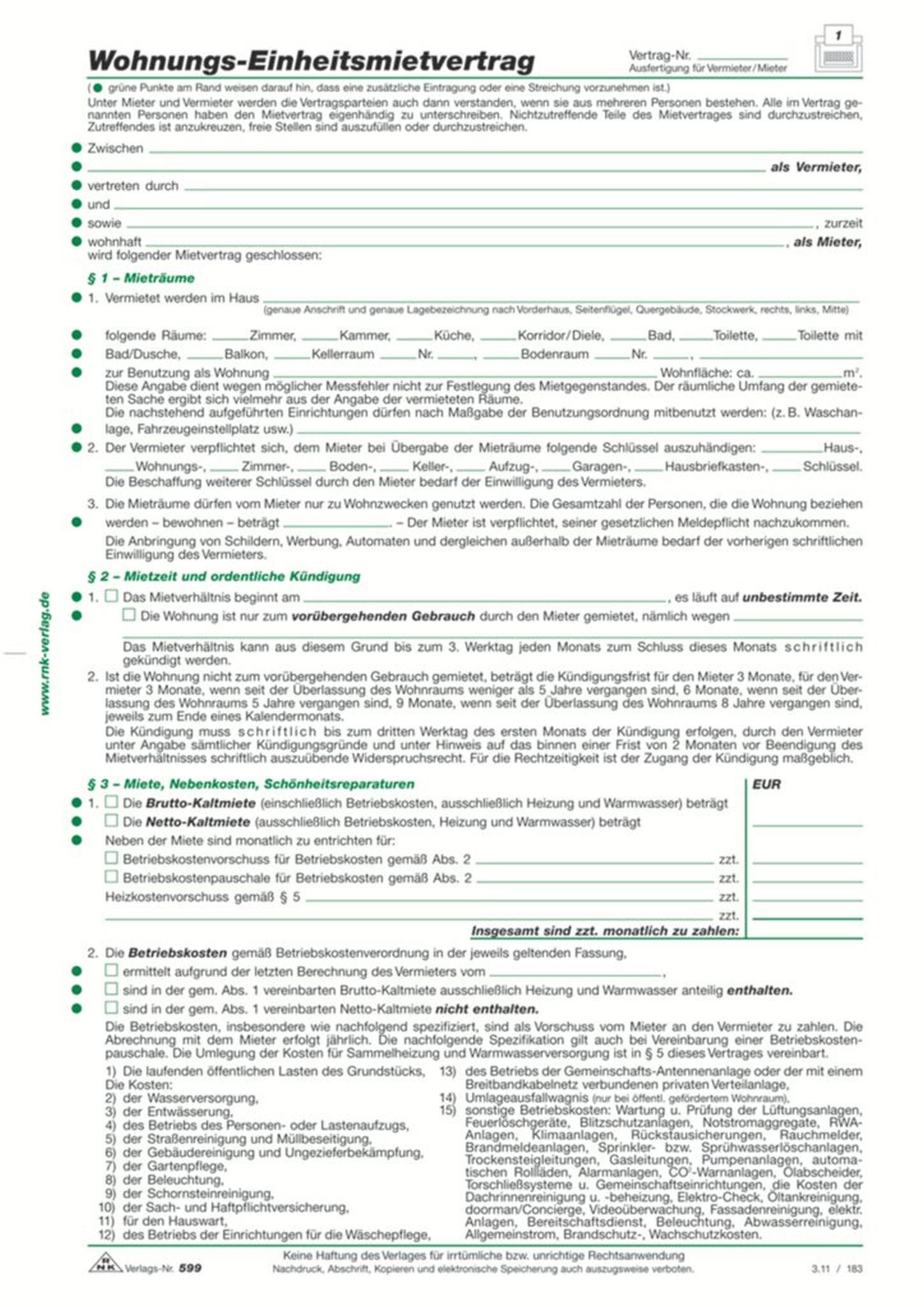 RNK Mietvertrag Wohnung DIN A4 Einheitsmietvertrag 10St
