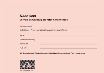• 10x RNK Verlag 3117 Nachweisheft für rote Kennzeichen 16 Seiten A5 quer