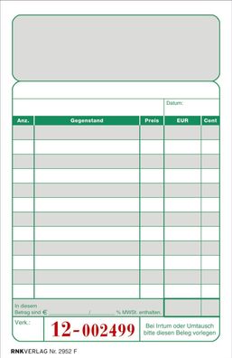 • 10x RNK Verlag 2952F Kassenblock zweifarbig oben geheftet 2 x 50 Blatt 96 x 167 mm nu
