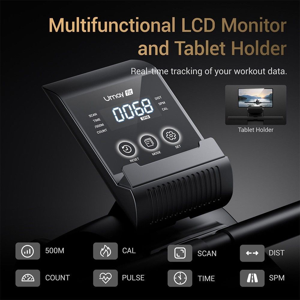 ROBORE UR20 Rudergerät, 126 cm verlängerte Lauffläche, leiser Betrieb, Schwarz