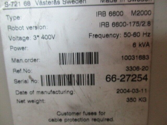 Roboter ABB Robotics IRB 6600 175 2.8 - inkl. 19% MwSt. Steuerung: S4C+ M2000 Anzahl der Achsen: 6 Max. Traglast: 175 kg max. Arbeitsbereich: 2800 mm Baujahr: 2004 Lieferumfang: Roboter,Steuerung,Kabel,Teachpanel,Schaltpläne Diskettenlaufwerk zur Datensicherung 2 Wochen Inbetriebnahmegarantie. Keine... Mehr