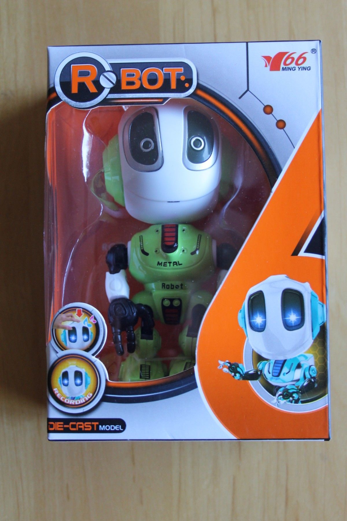 Der Roboter ist am Kopf, den Händen und Füßen beweglich. Die Höhe beträgt ca. 120 mm. Er hat 2 Funktionen: F. 1: Nur Sound und Licht (Robotergeräusche und die Augen leuchten) F. 2: Sound und Licht Augen leuchten) und Nachsprechen. Farbe des Roboters: grün weiß Mit Selbstabschaltung nach ca. 1 min. D