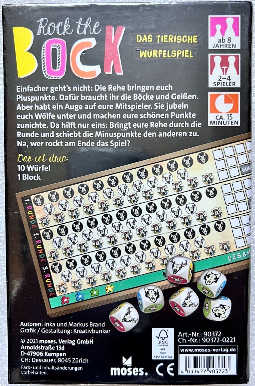 Spieleranzahl: 2 bis 4 Spieler Spieldauer: 15 Minuten Altersempfehlung: 8 + Rock the Bock - Würfelspiel Wer hat Bock auf ein tierisch gutes WürfelspielEuro Einfacher geht’s nicht: Die Rehe bringen Pluspunkte. Dafür braucht man die Böcke und Geißen. Aber es ist ratsam, immer ein Auge auf die Mitspiel