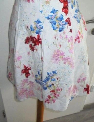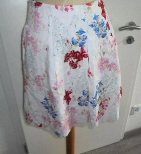 getragener Rock mit Gürtelschlaufen Kellerfalte weiß farbig mit farbigen Blumenmotive Bundweite einfach gemessen: 34 cm gesamt Länge seitlich gemessen. 49 cm gut erhalten 97% Baumwolle 3 % Elasthan Versand 2,80€ Der Verkauf folgt unter Ausschluss jeglicher Gewährleistung und Rücknahme, da es sich um