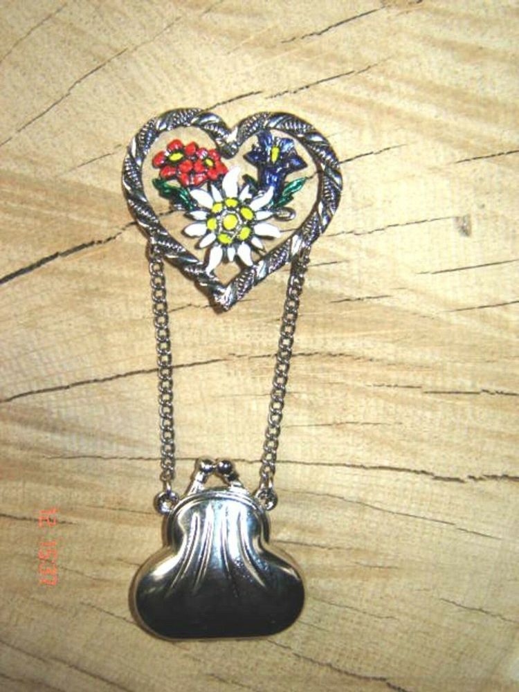 . Dirndlschmuck , Trachtenschmuck , herzallerliebstes Rocktäschchen aus Metall ein Muß für jedes Dirndl Gwand für Kleingeld oder andere Kleinigkeiten großes Herz mit handbemalten Alpenblumen Edelweiß , Enzian und Alpenrose zum Anstecken am Rock oder an der Schürze mit einer Nadel das Täschchen ist c