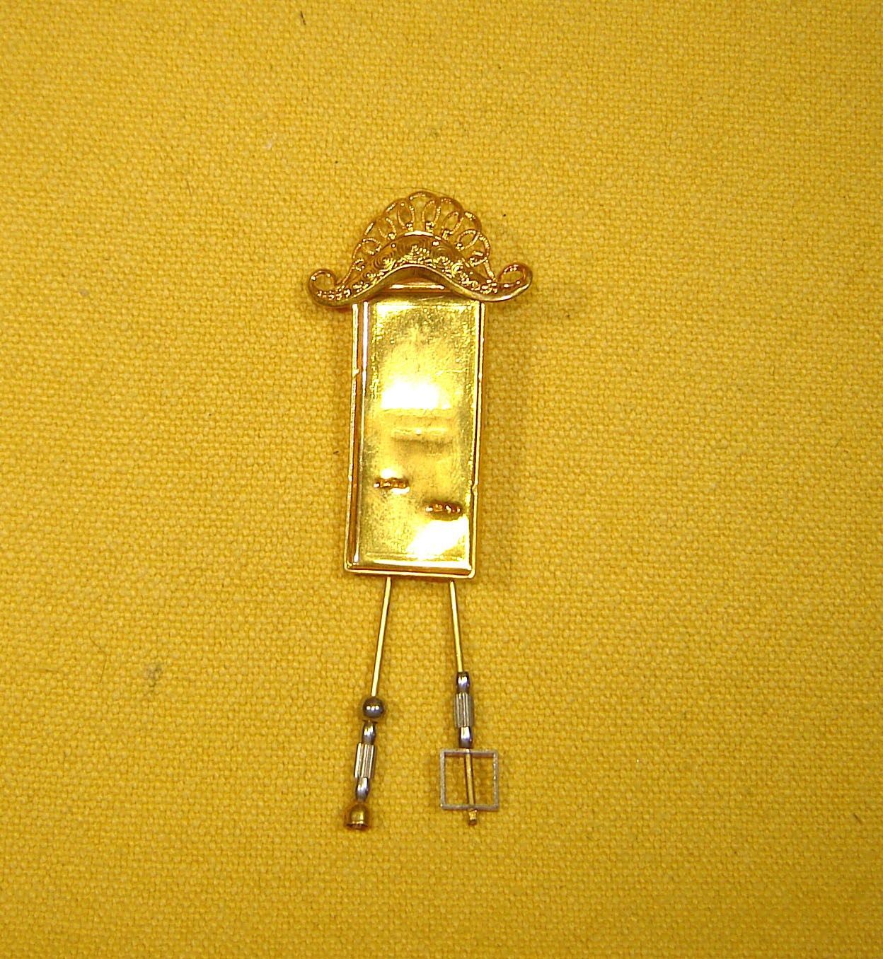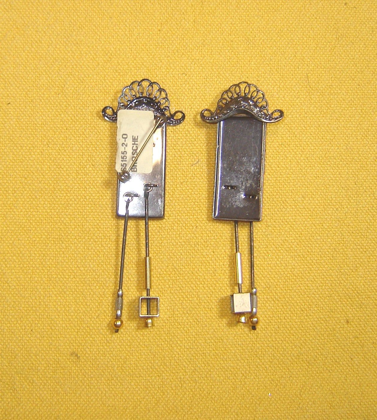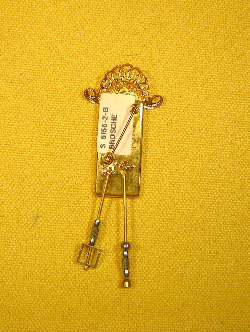. Vintage Brosche filigran mit beweglichen Pendeln Rohling d.h man hat mittig einen Platz um etwas anzubringen , Steine emaill usw Größe ca 10 x 3,3 cm aus Metall in Farbe Gold glänzend oder altsilber ausgezeichnet verarbeitet , aus deutscher Herstellung Auflösung einer kleinen alten Schmuckfabrik .