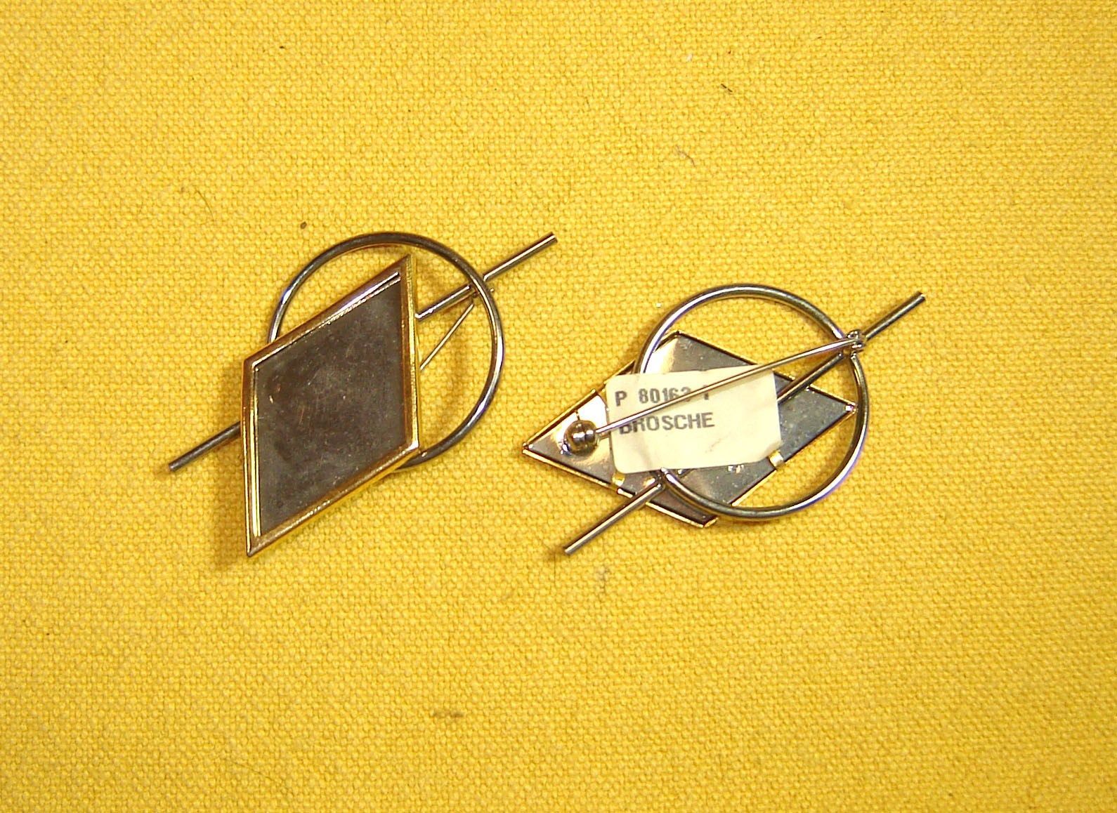 . Vintage Brosche geometrisch Rohling d.h man hat mittig einen Platz um etwas anzubringen , Steine emaill usw Größe ca 6,7 x 3,5 cm aus Metall in Farbe silber goldfarben ausgezeichnet verarbeitet , aus deutscher Herstellung Auflösung einer kleinen alten Schmuckfabrik . Bitte Sehen Sie sich hier alle