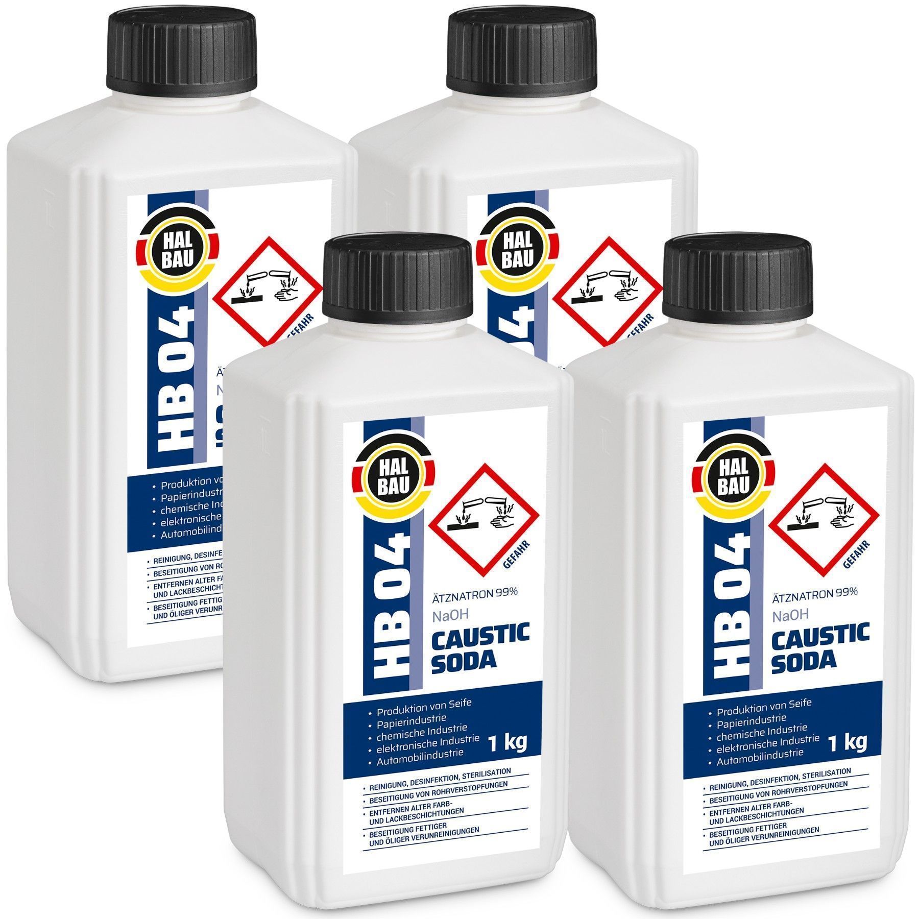 HALBAU Ätznatron Granulat HB04 - 4 KG Natriumhydroxid NaOH PRODUKTION VON REINIGUNGSMITTELN UND FARBSTOFFEN PRODUKTION VON SEIFE PAPIERINDUSTRIE CHEMISCHE INDUSTRIE ELEKTRONISCHE INDUSTRIE REINIGUNG, DESINFEKTION, STERILISATION BESEITIGUNG VON ROHRVERSTOPFUNGEN ENTFERNEN ALTER FARB- UND LACKBESCHICH