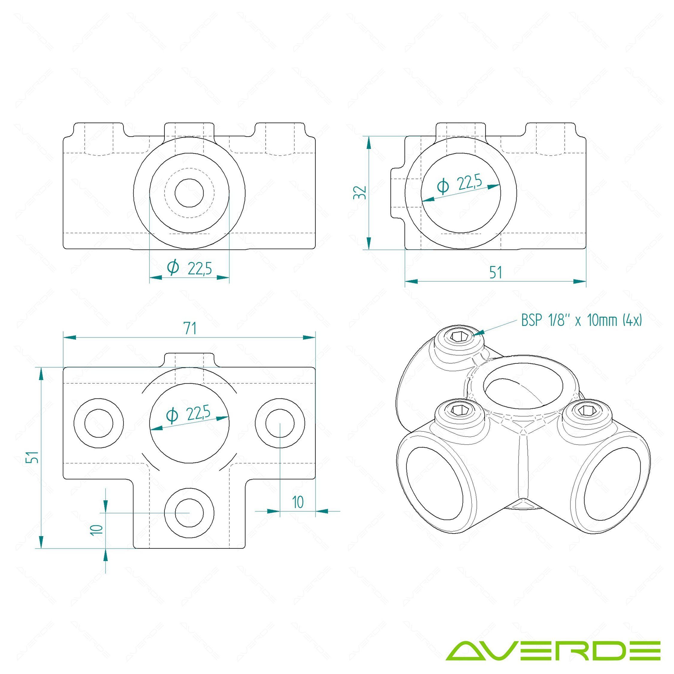 Rohrverbinder 4-fach Kreuzverbinder 1/2" (21,3 mm), 90° - Durchgang AVERDE
