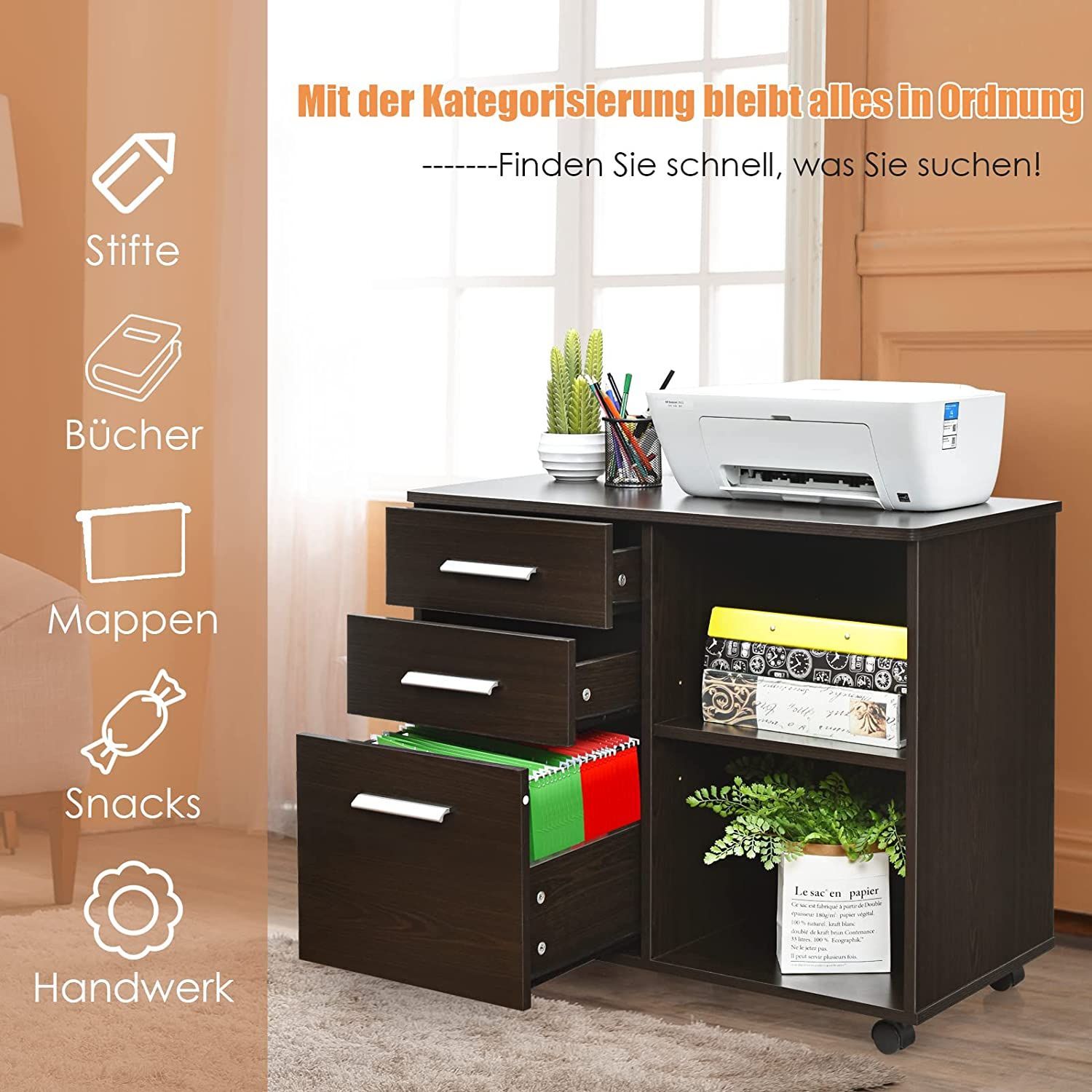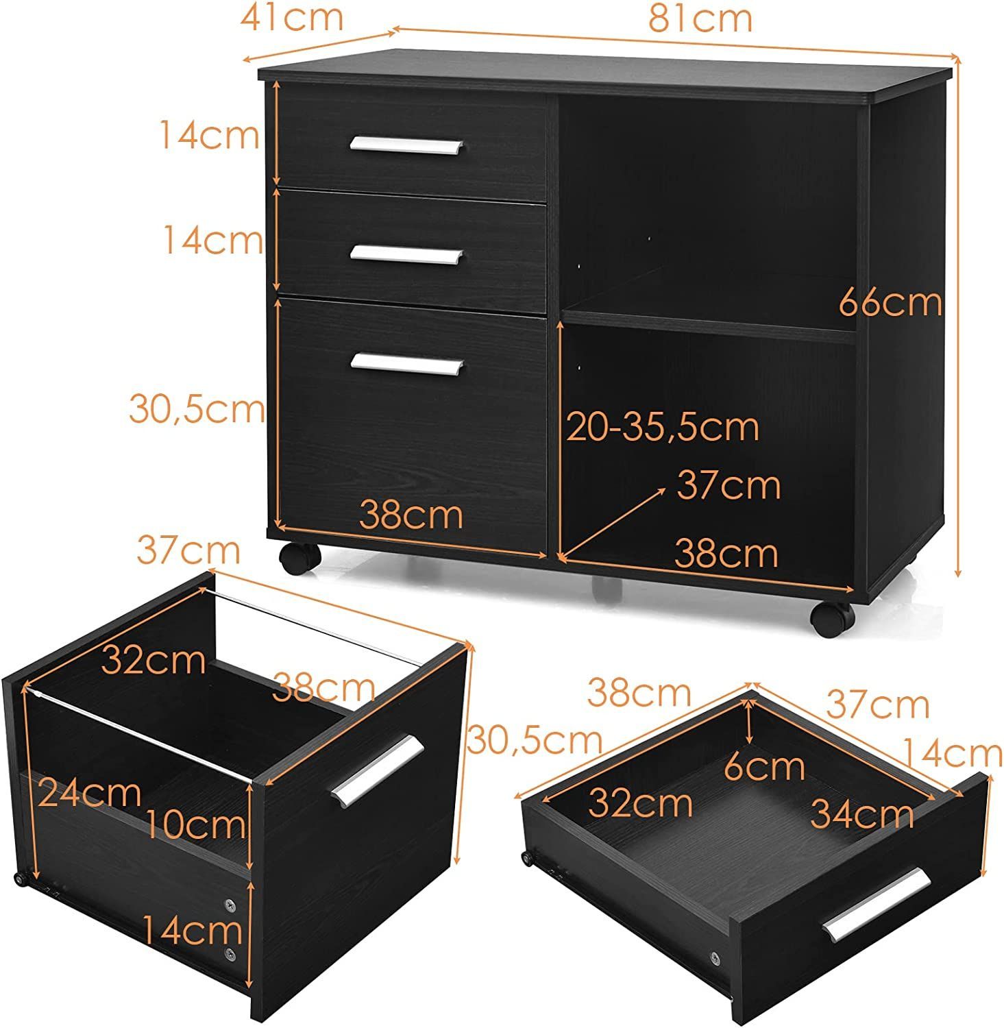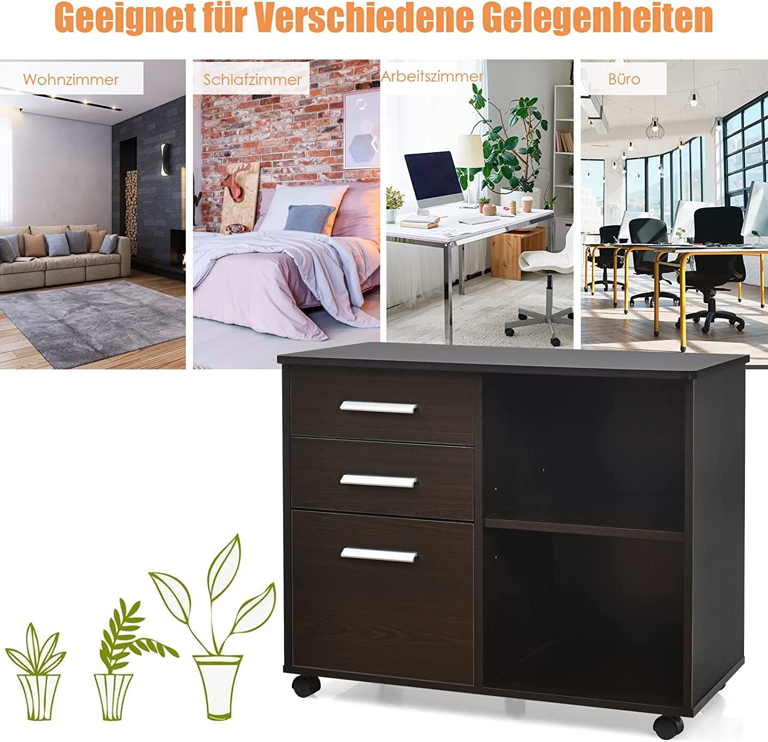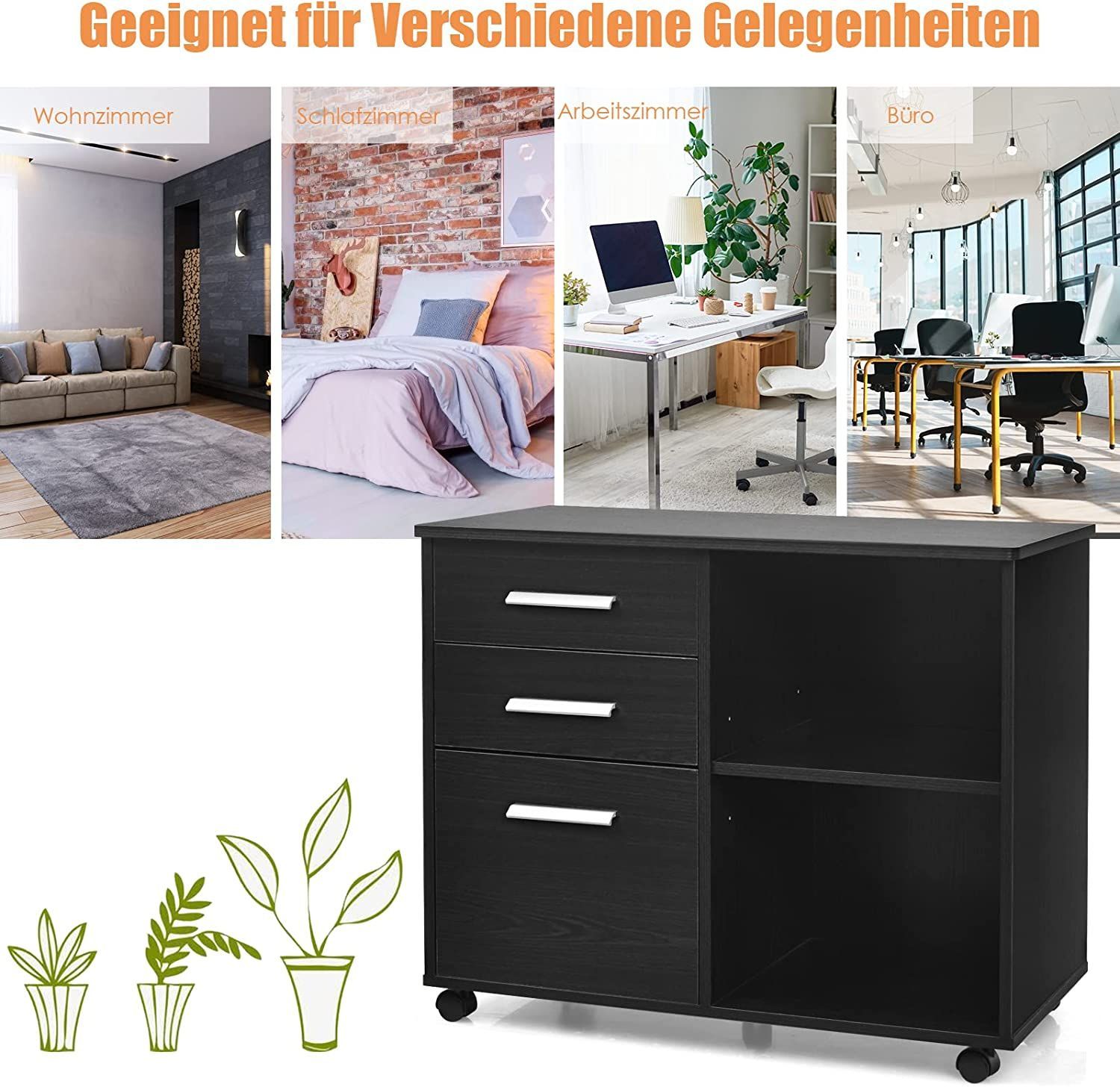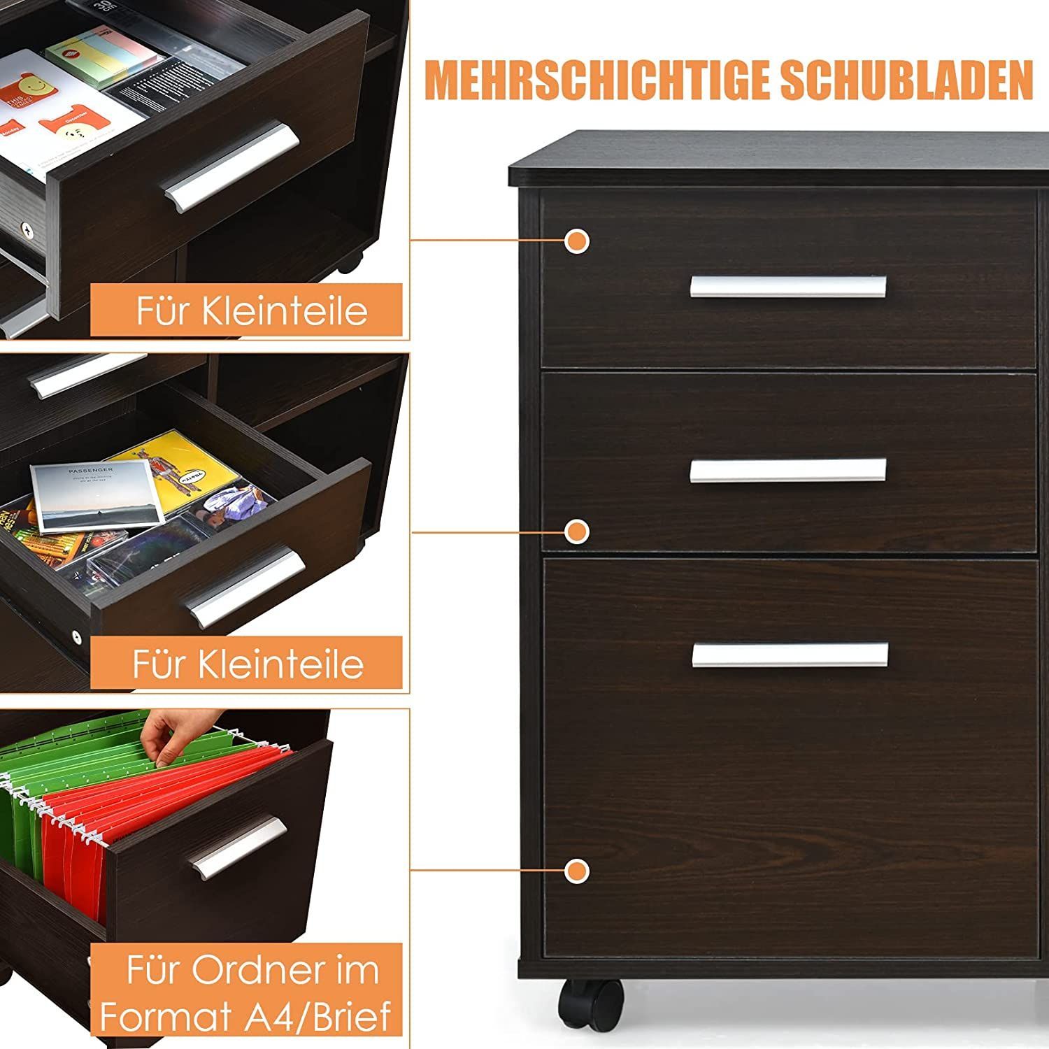 Rollcontainer mit 3 Schubladen, mobiler Aktenschrank mit Rädern, Aufbewahrungsschrank