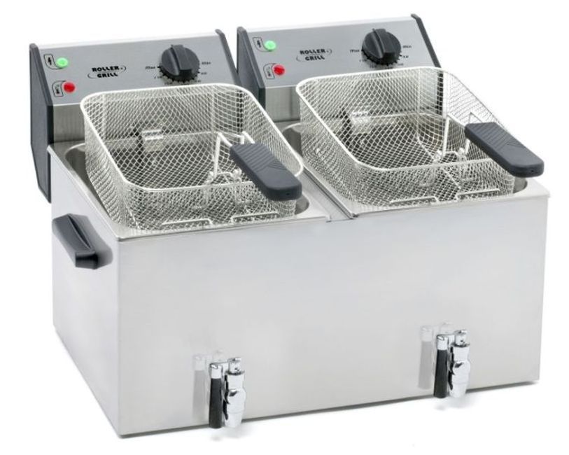 Roller Grill Elektro Fritteuse 2x8 Liter - mit Ablasshahn, Kaltzone, Edelstahl