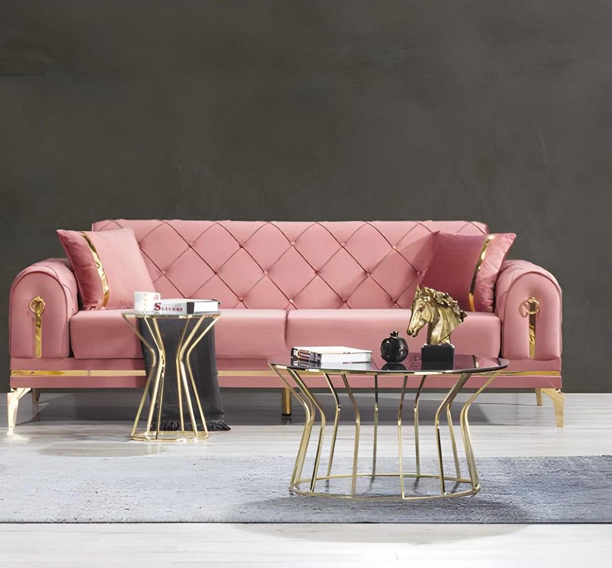 Rosa Chesterfield Textilcouch Designer 3-Sitzer Edelstahl Luxus Möbel