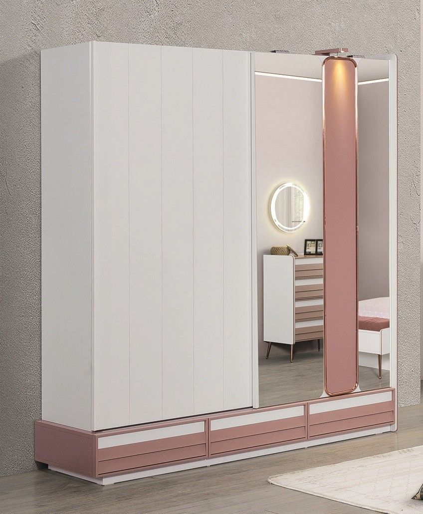 Im Angebot enthalten: 1x Kleiderschrank 3-trg. B H T: 171x213x68cm mit 3 Türen oder 1x Schiebetüren Kleiderschrank Rose MDF-Platte 2x Schiebetüren mit Softclose Mechanismus 8x Fächer 3x Schubfächer mit Softclose Mechanismus 2x Kleiderstange mit LEDs 1x LED Beleuchtung außen Elemente in Rosé metallic