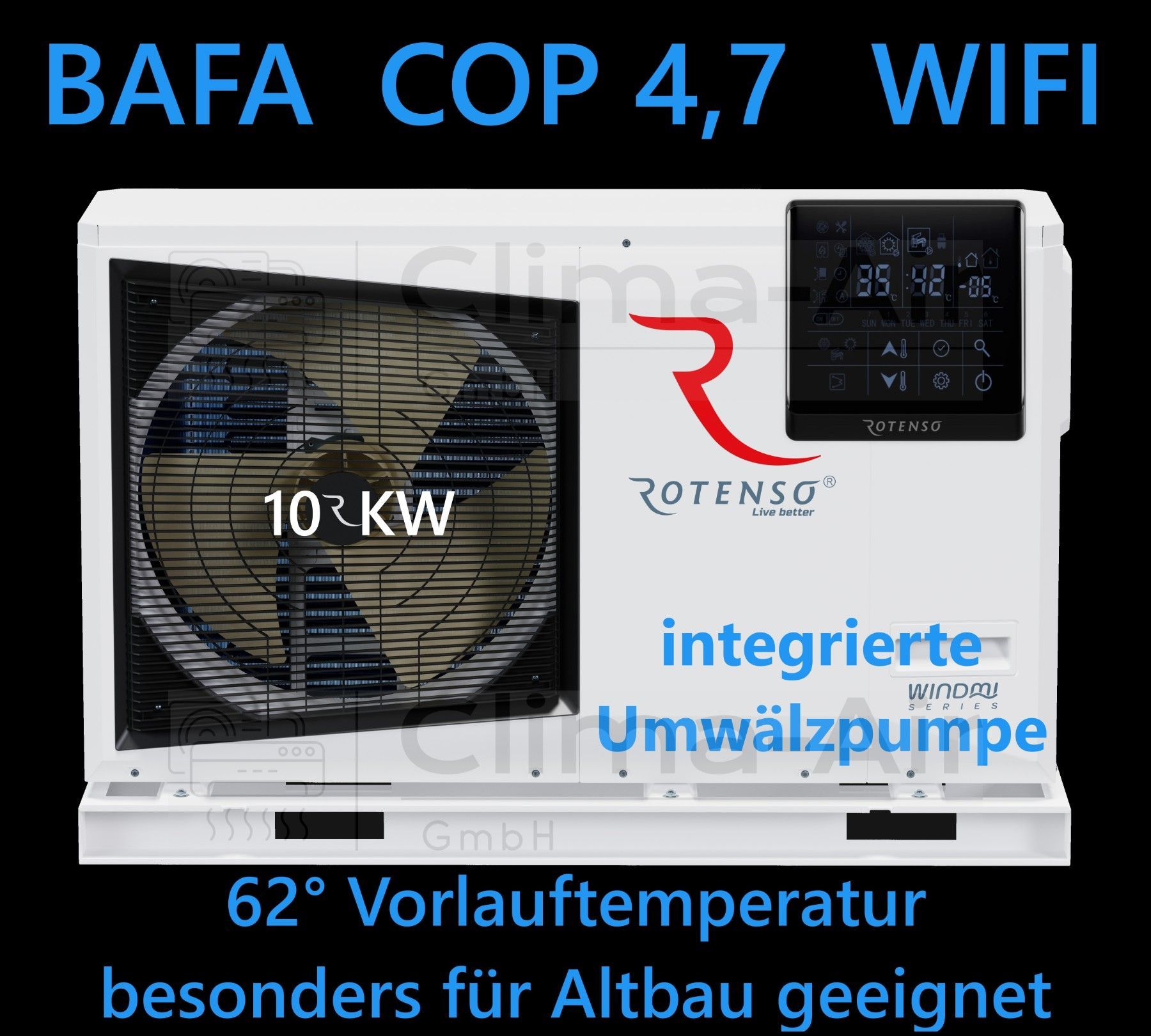 Rotenso Windmi Wärmepumpe Monoblock Luft-Wasser 10KW BAFA Wifi A+ + + , Heizen Kühlen