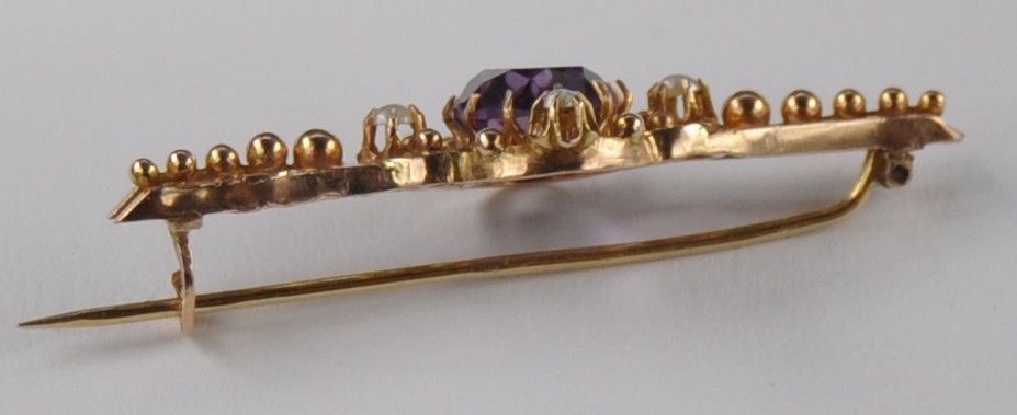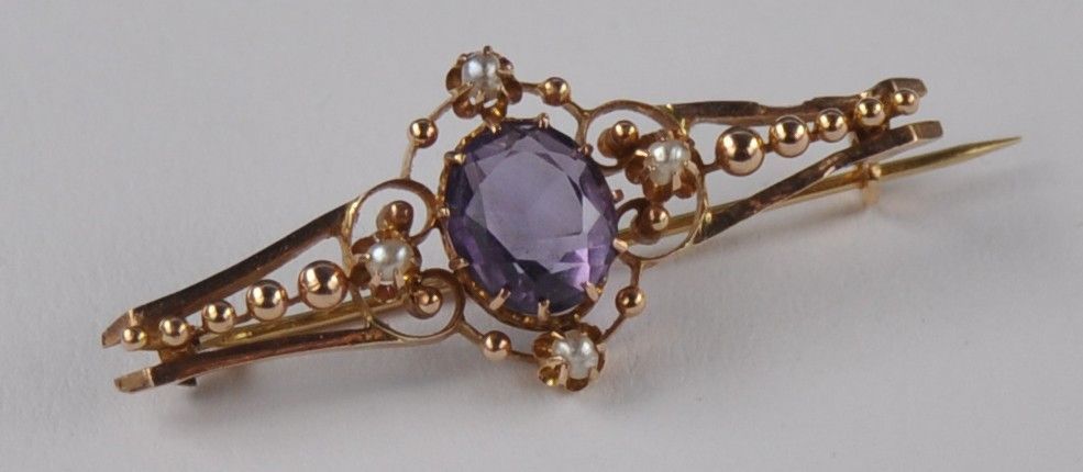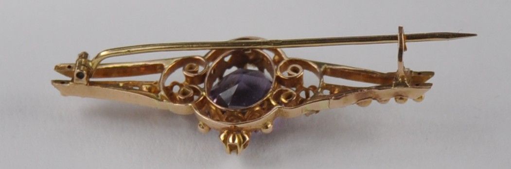 Rotgold Brosche Nadel Amethyst Saat Fluß Perle 750 Gold Antik Neu wertig