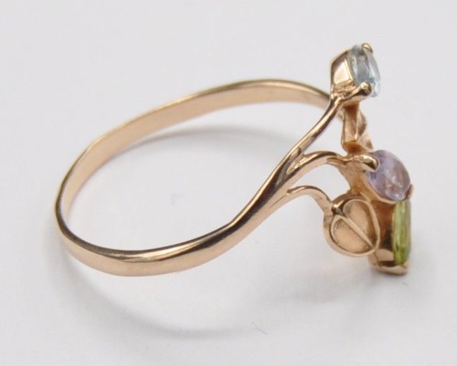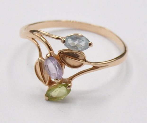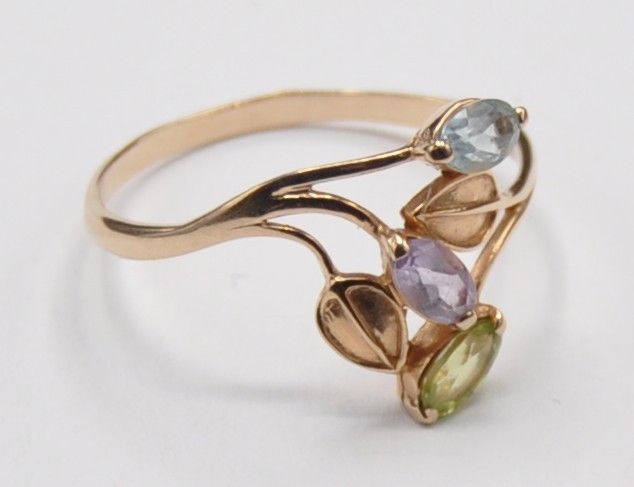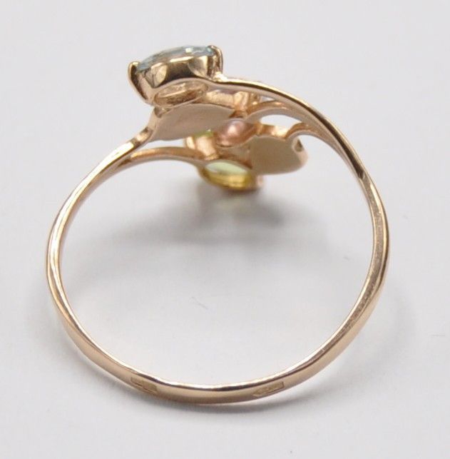 Der Ring ist fein und filigran aus Rosegold gearbeitet und wiegt knapp 2 Gramm. Der Ringkopf ist 1,85 cm Breit und trägt 3 Steine und 2 Goldverzierungen als Blätter. Der Ring hat einen Innendurchmesser von 1,93 cm und ist 585 gestempelt. Ich habe noch mehr Schmuck eingestellt.