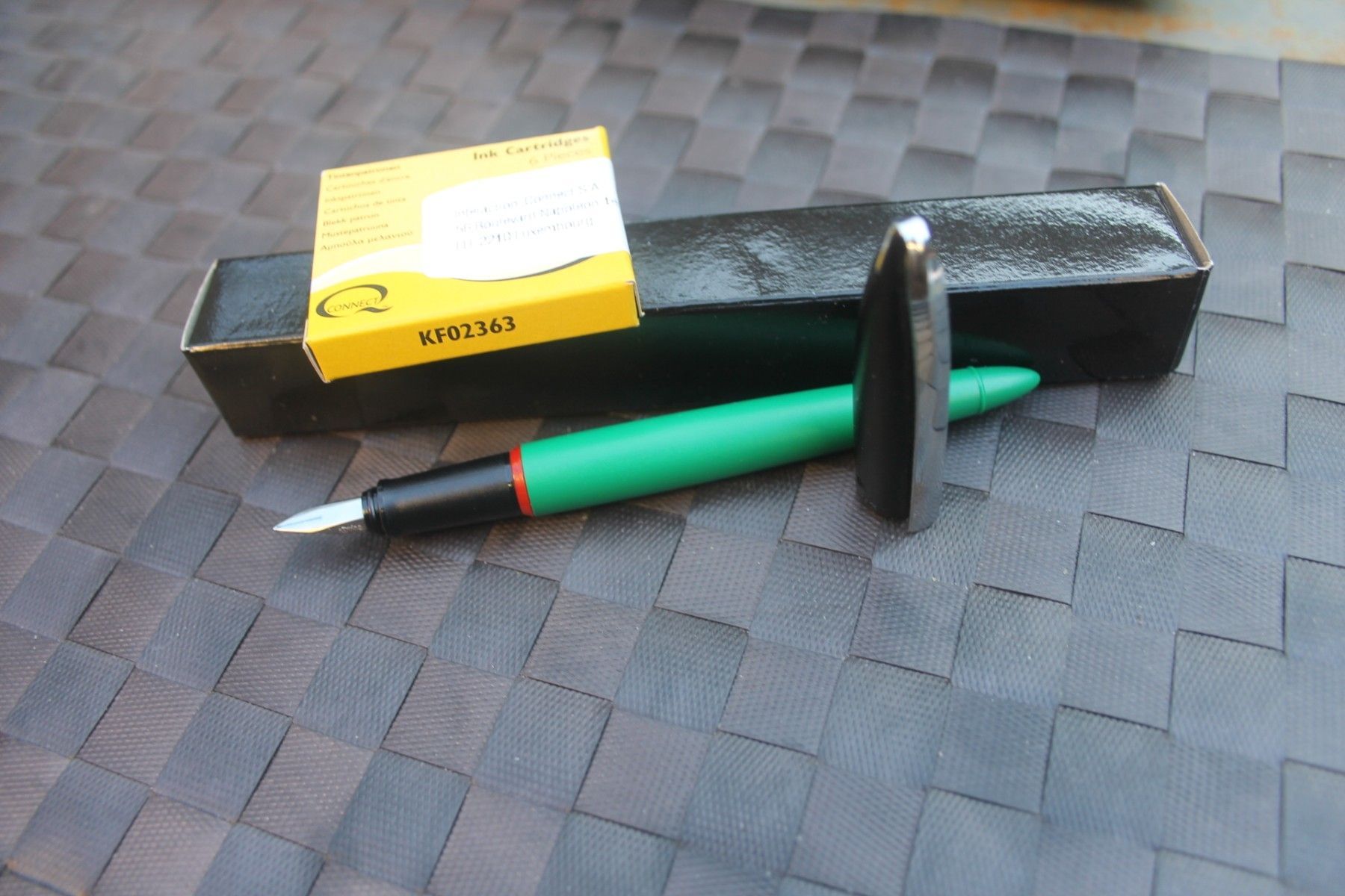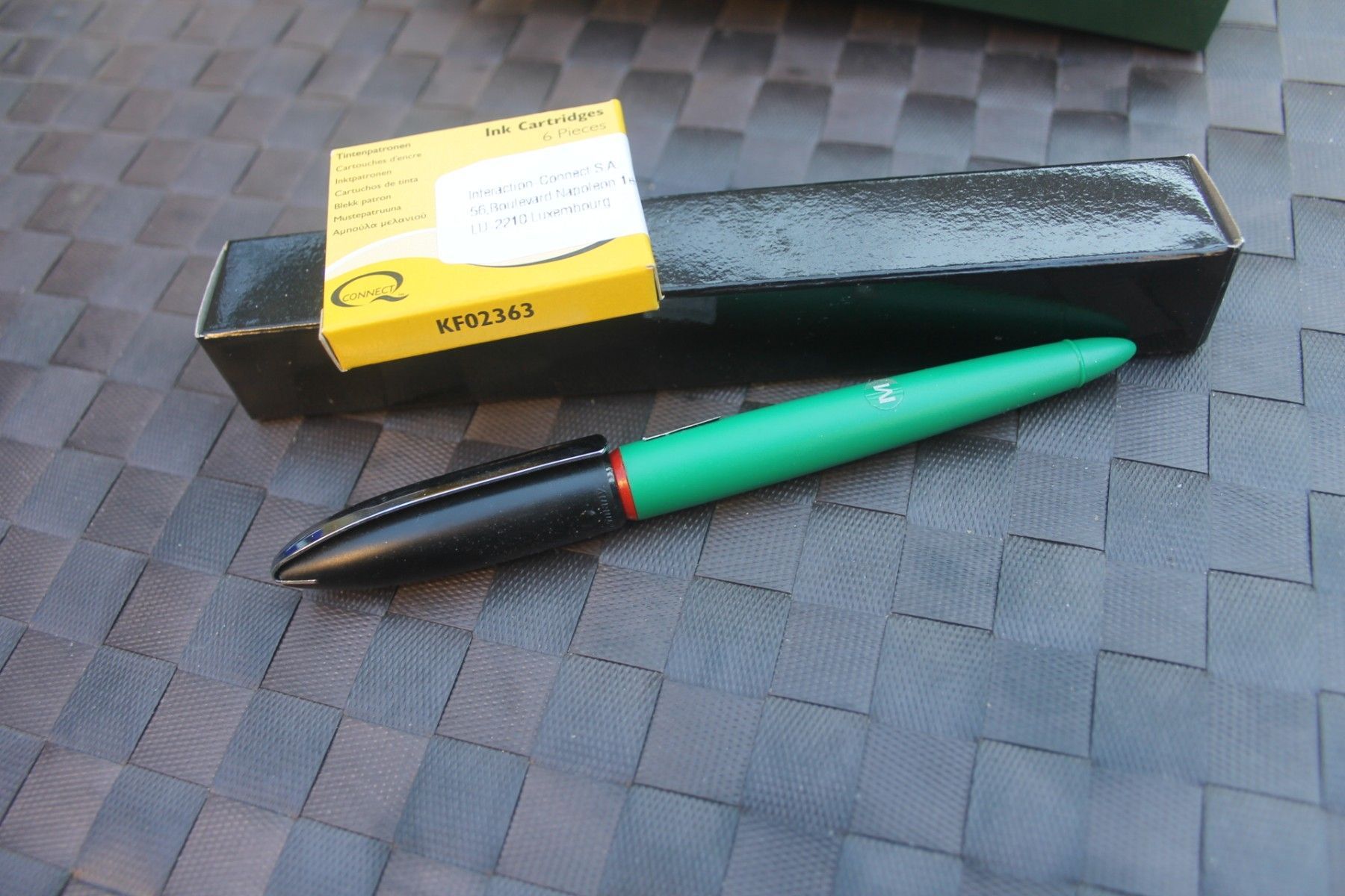 Füller mit M-Feder. Mit Iridium-Korn. Es können Pelikan-Tintenpatronen (System Pelikan !) verwendet werden. Eine Schachtel Patronen ist dabei. Neu = unbenutzt.
