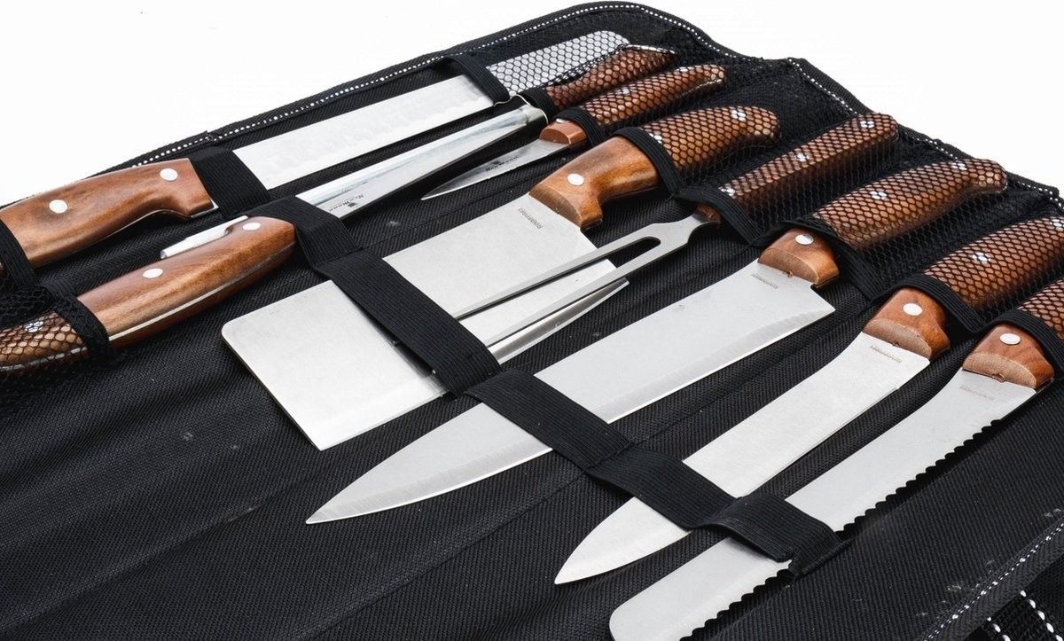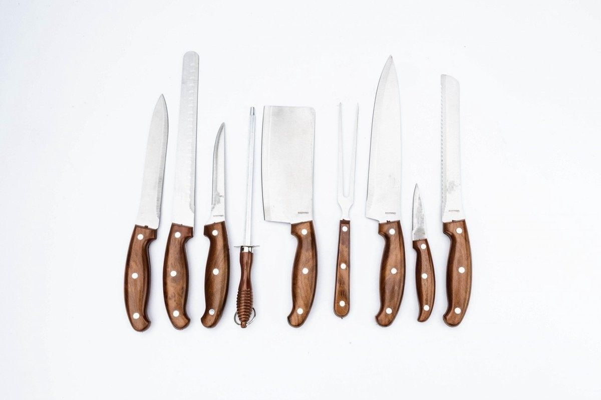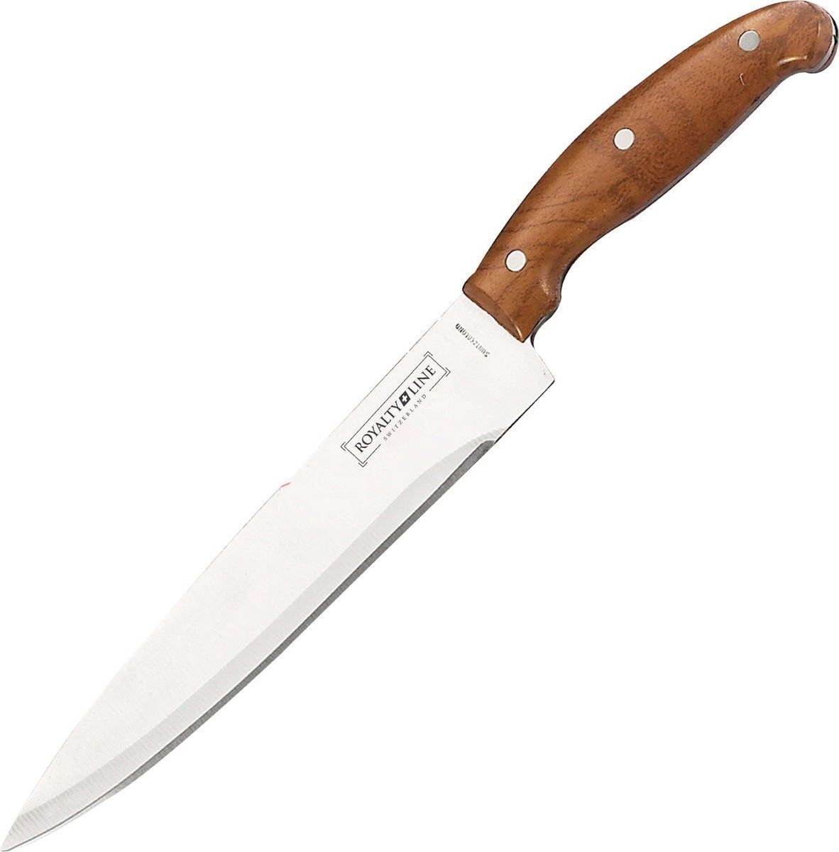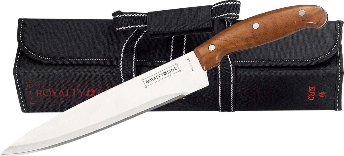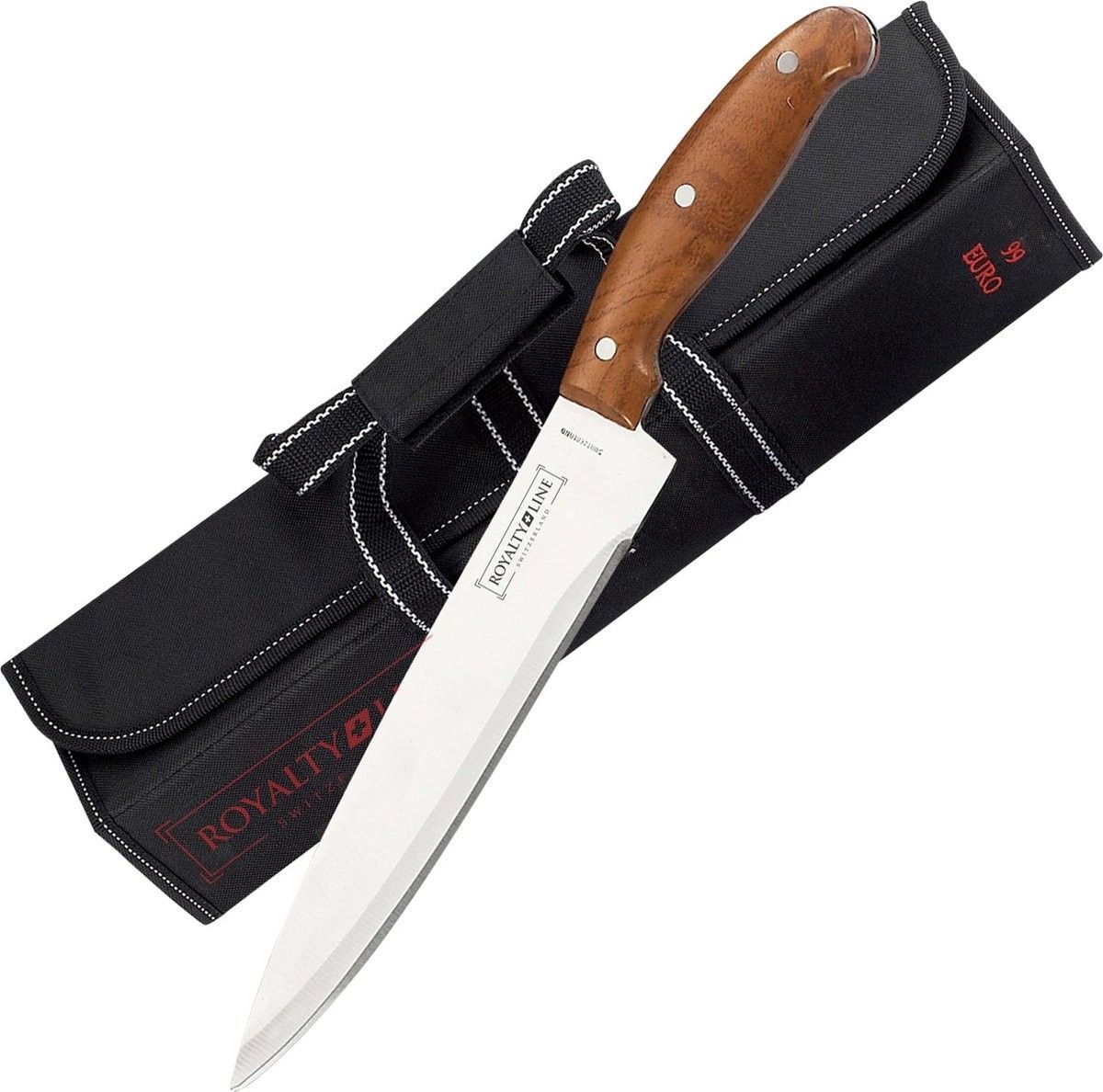 Royalty Line 9-teiliges Messerset mit scharfen Edelstahlklingen, ergonomischen Griffen in edler Holzoptik und stilvollem Lederetui. Enthält Allzweckmesser, Hackmesser, Käsemesser und sechs weitere Spezialmesser – ideal für jede Schneidaufgabe. Präzise Verarbeitung, langlebige Materialien und sichere Aufbewahrung machen es zum perfekten Küchenhelfer und eleganten Geschenk.