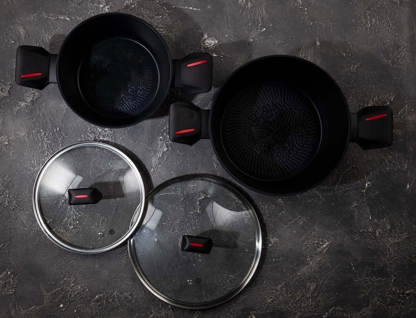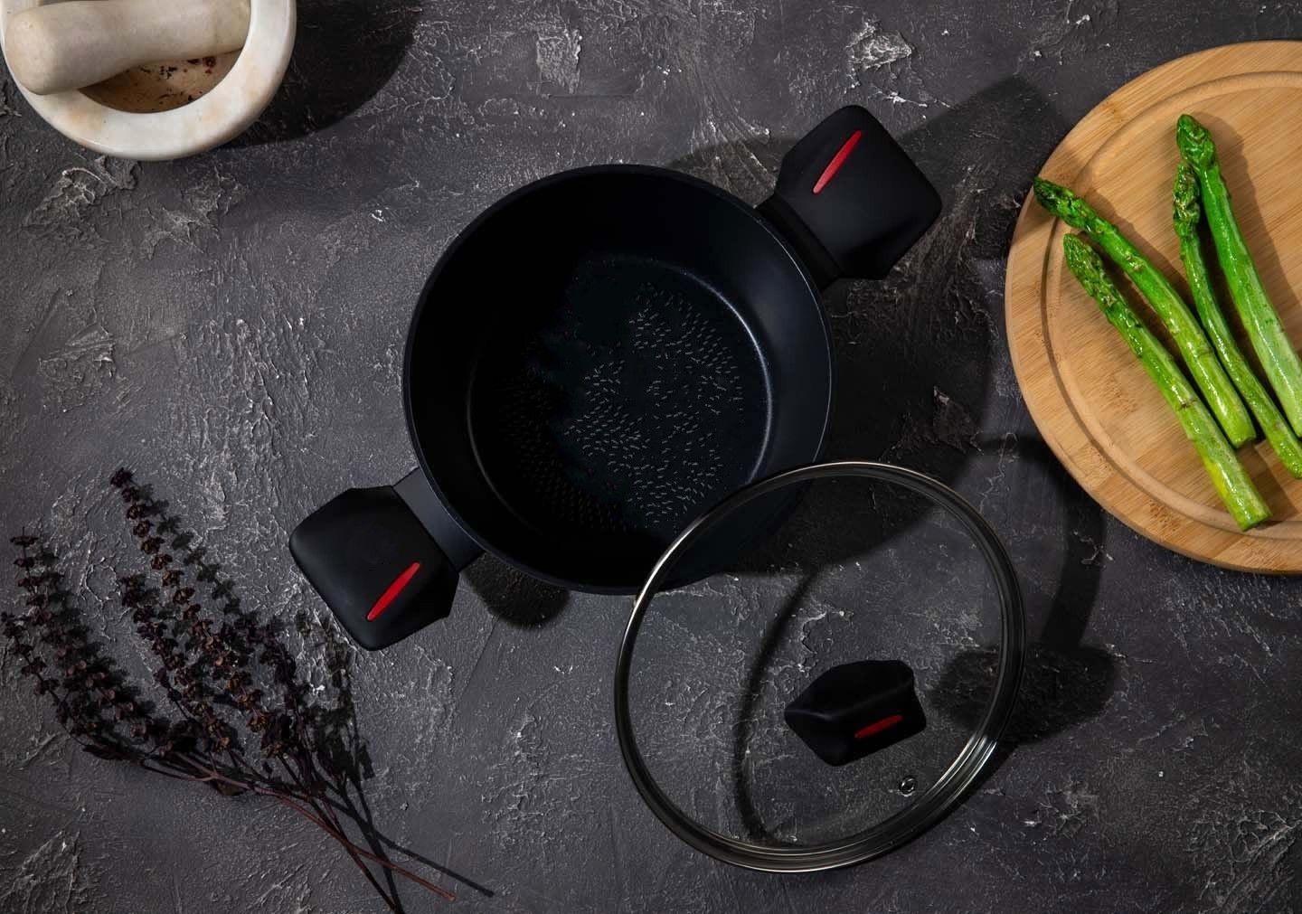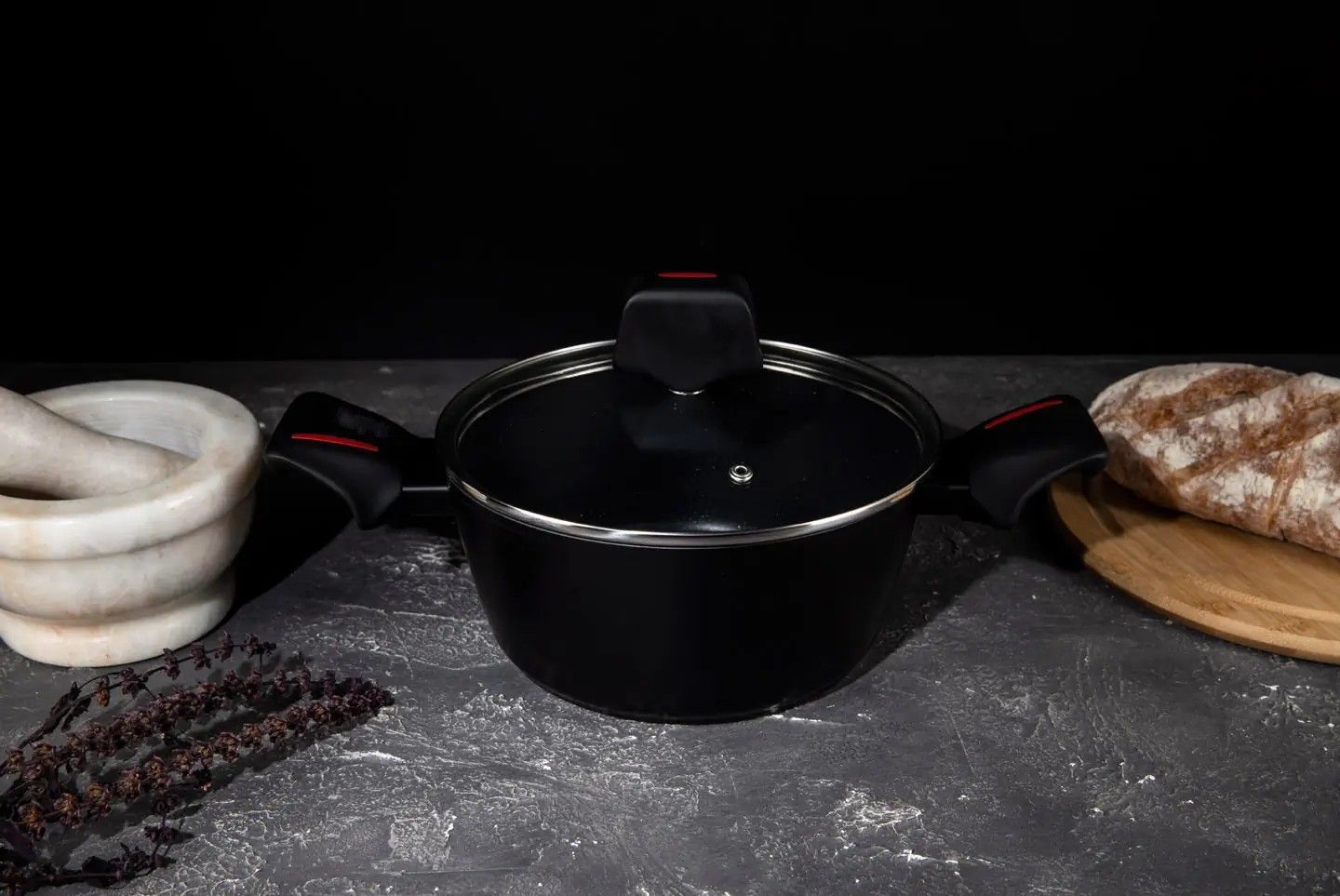 Royalty Line RL-FSN20 20 cm Schmortopf aus Aluminiumlegierung mit kratzfester Marmorbeschichtung für fettarmes Kochen und gleichmäßige Wärmeverteilung. Gehärteter Glasdeckel mit Dampfauslass, ergonomischer Bakelit-Griff, flacher induktionsgeeigneter Boden. Spülmaschinenfest und leicht zu reinigen – perfekt für Suppen, Soßen, Getreide oder gedämpftes Gemüse.