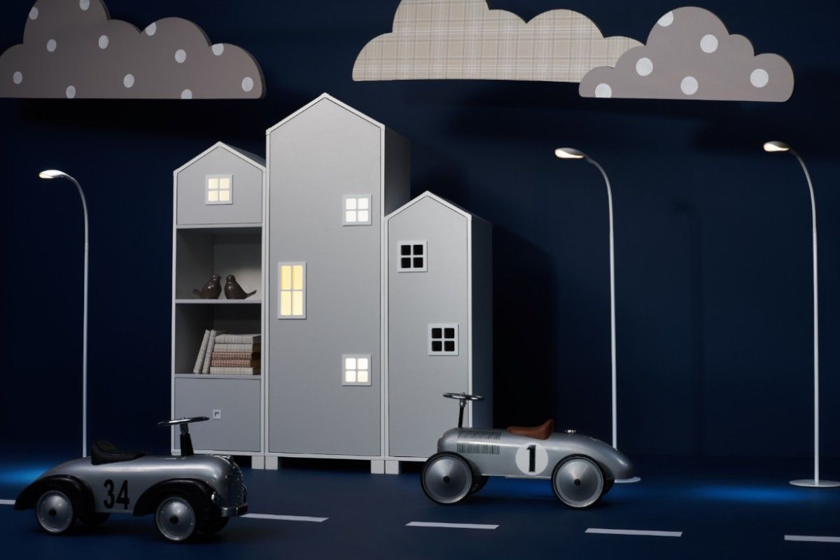 Bücherregal mit Schublade, ein Haus für einen Jungen, grau