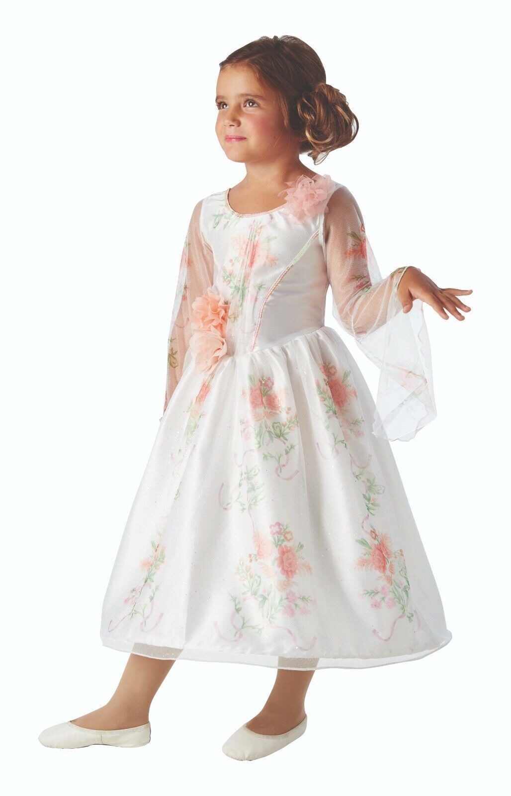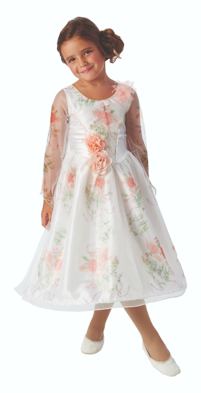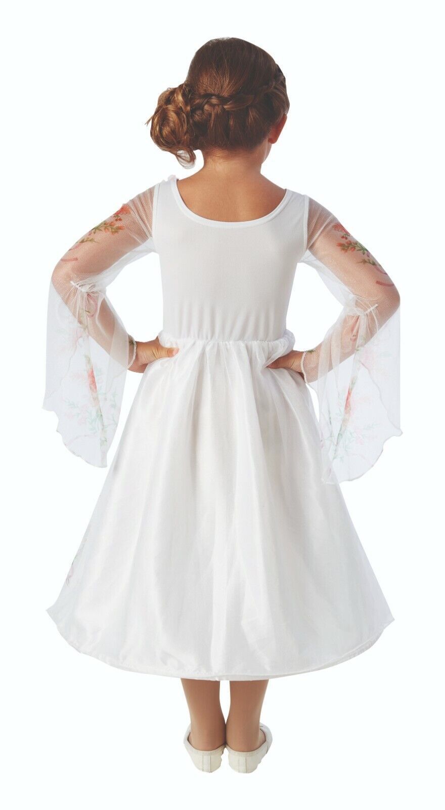 Belle Live Movie Celebration von Rubies Träume werden wahr mit dem Belle Hochzeitskleid. Weißes Belle Hochzeitskleid für Kinder bestehend aus Satin mit transparenten Glockenärmeln aus Organza, befestigten Blüten an Bauch und Schulter, einem glitzernden Organzarock mit Blumendruck und Reifrock. Beinh