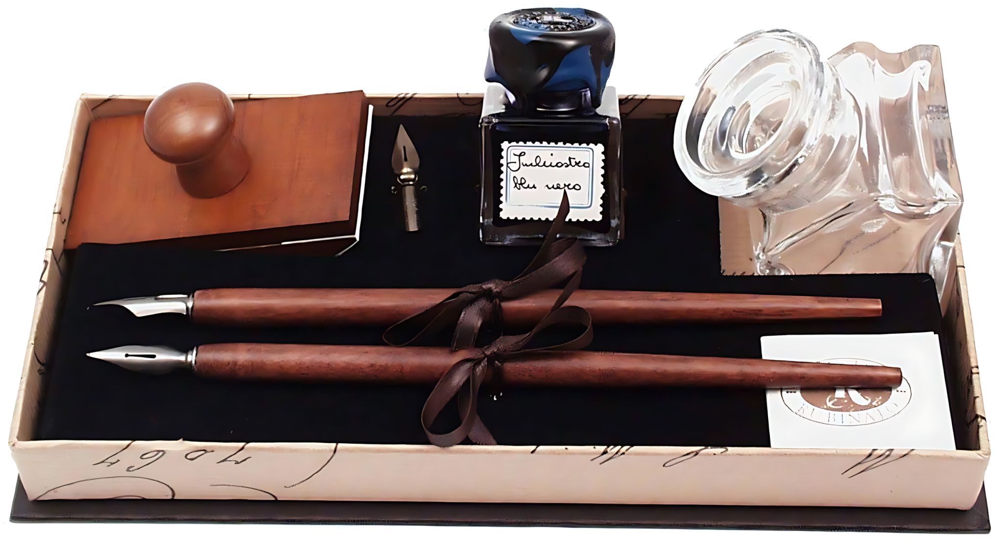 Rubinato Holzfederhalter Geschenkbox 2x + 3 Federn, Tinte und Tintenfass