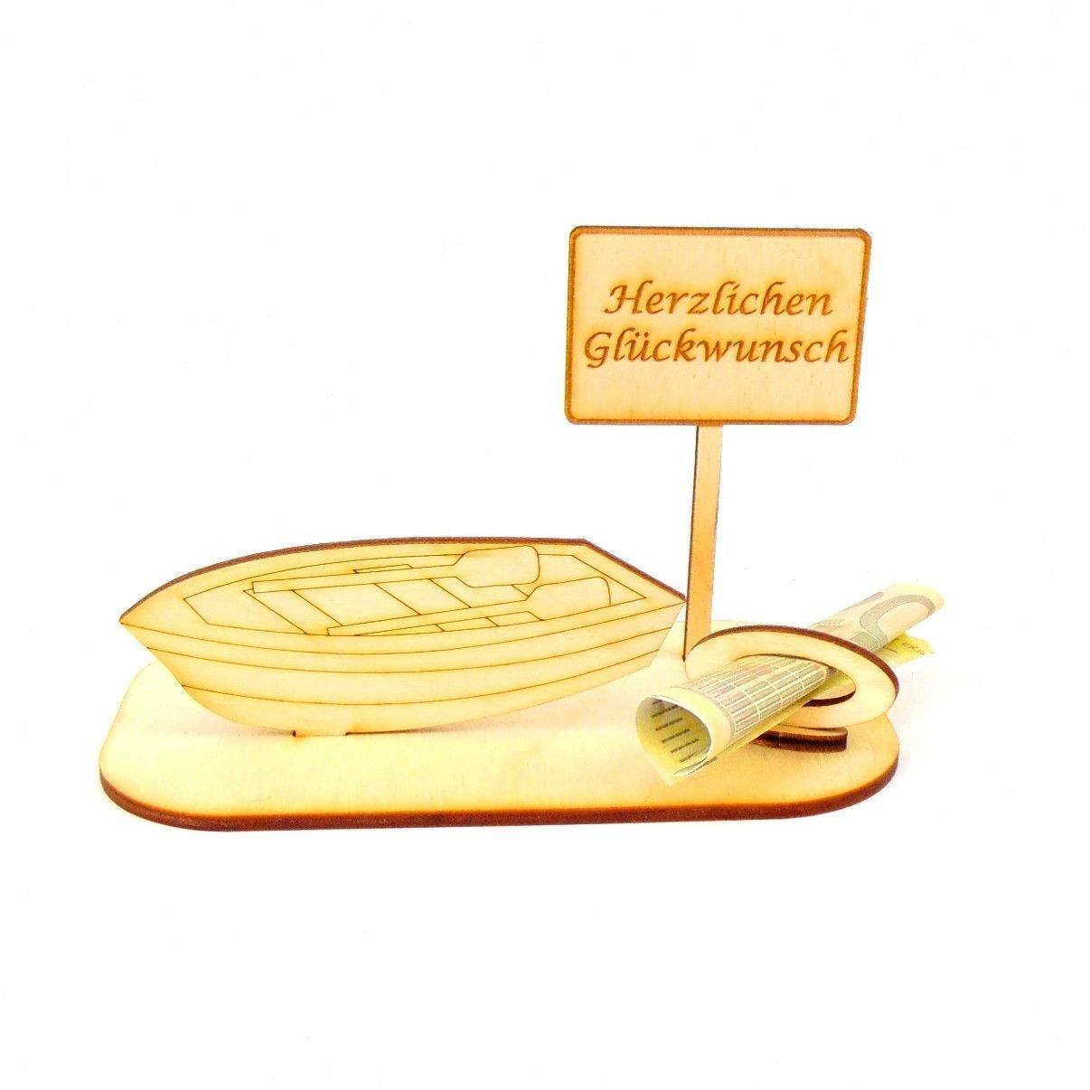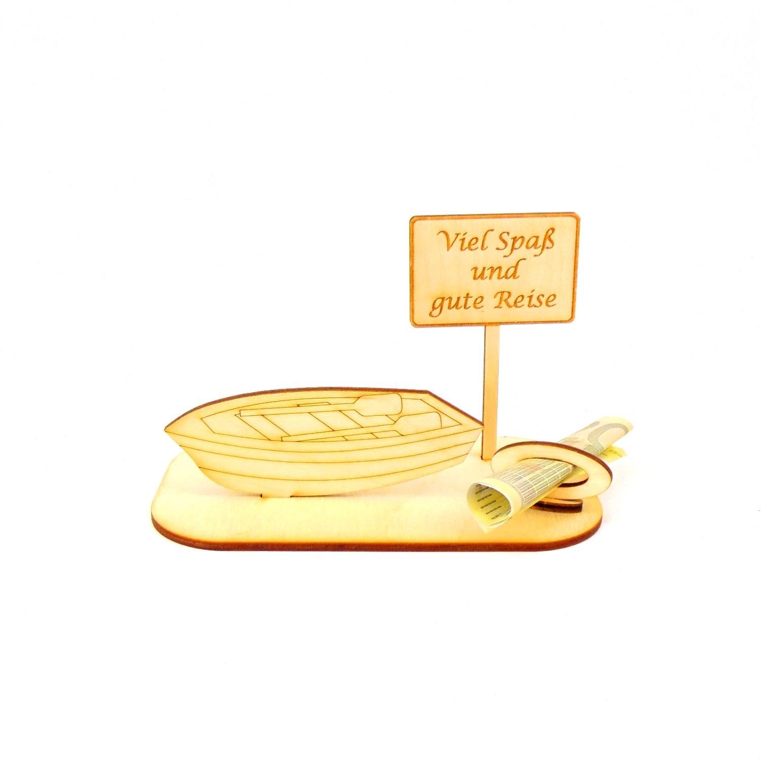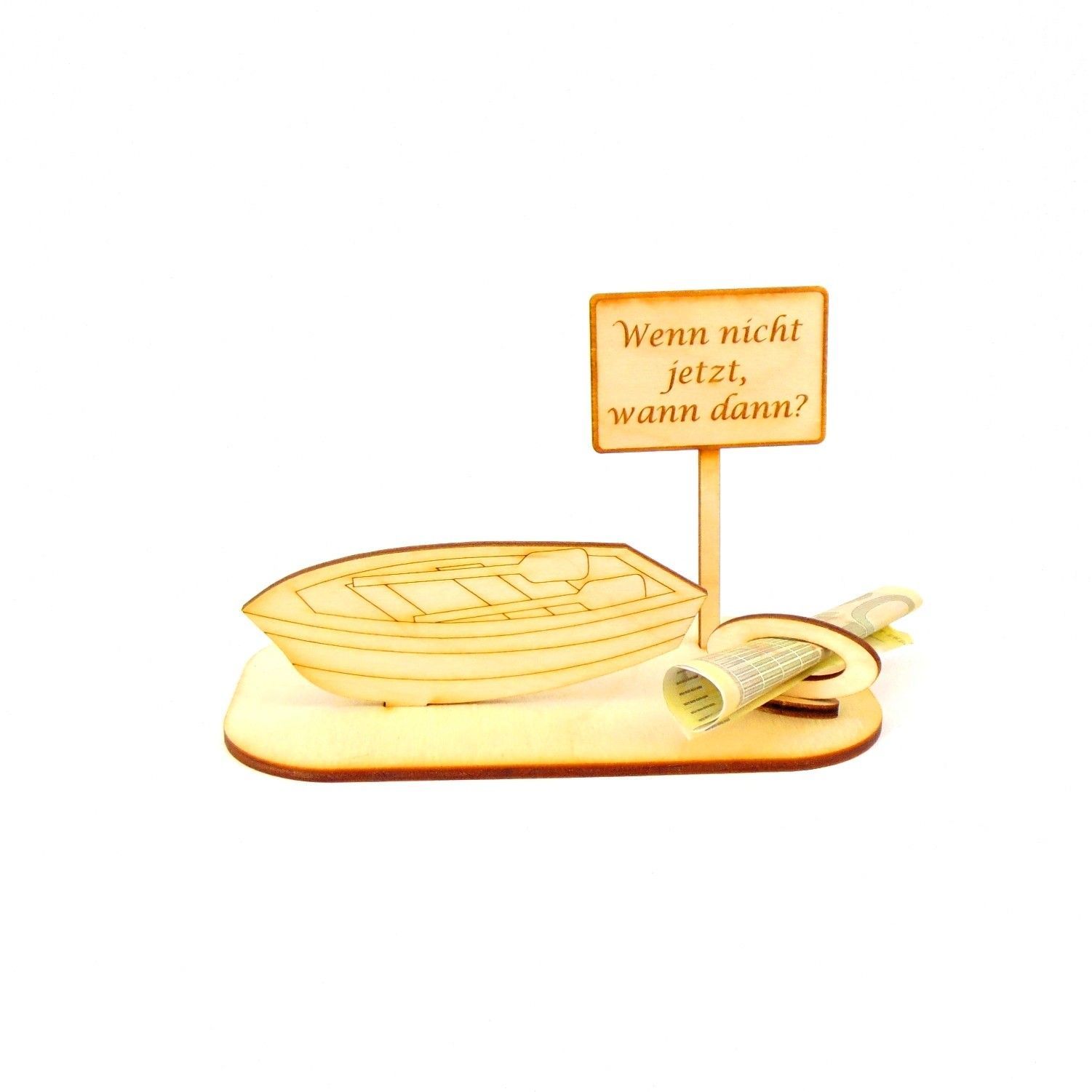 Ruderboot Personalisiert aus Birkenholz für Geldgeschenk und/oder Gutscheingeschenk zum Geburtstag Die Ortsschilder sind mit verschiedenen vorgegebenen Texten oder Sie teilen uns Ihre Wunschgravur mit. Sie erhalten 6 Teile aus 3 mm Birkenholz gelasert. Das Geldgeschenk besteht aus der Grundplatte 14cm x 8cm, einem Ruderboot 10cm x 4cm, einem Schild 5,5cm breit und 9cm hoch.