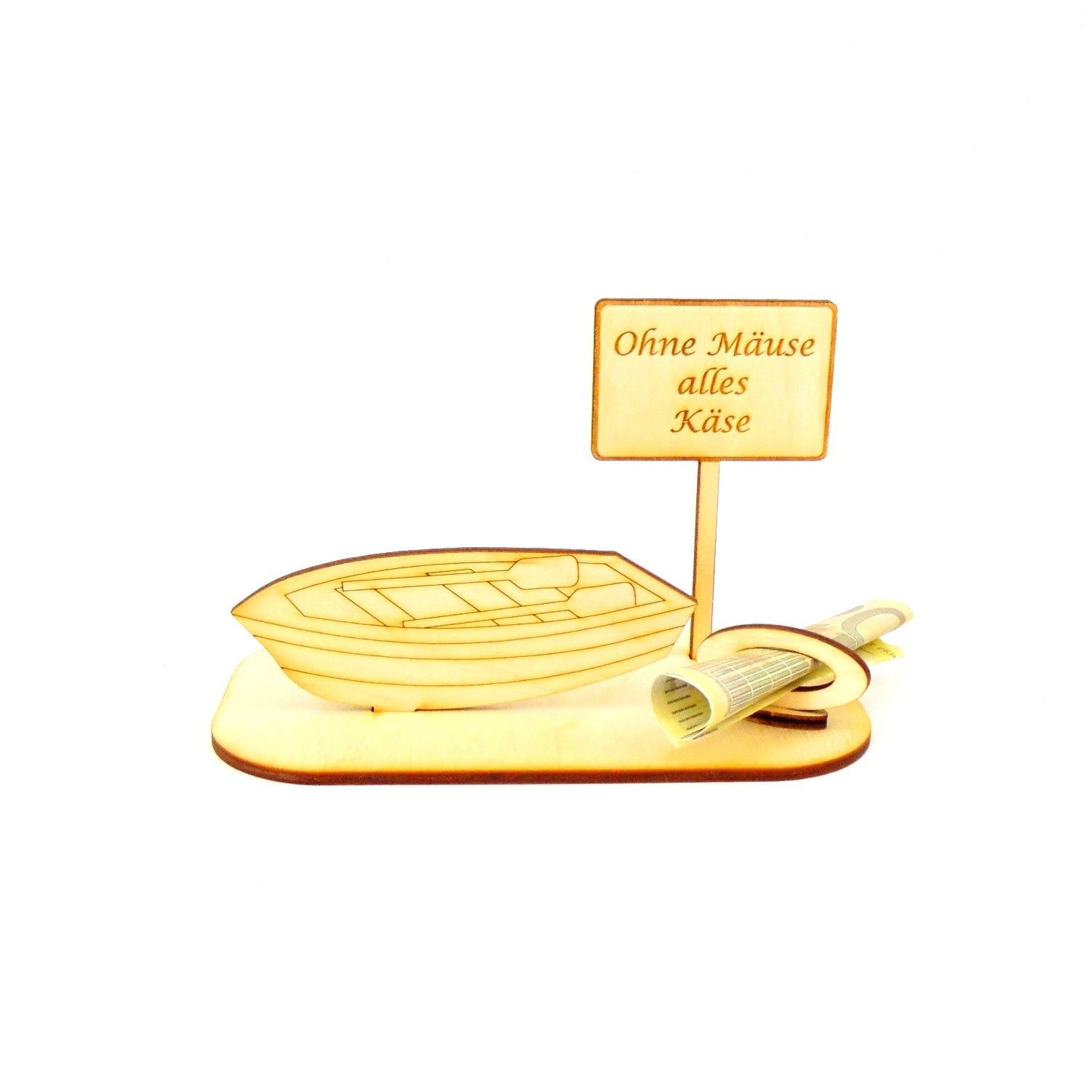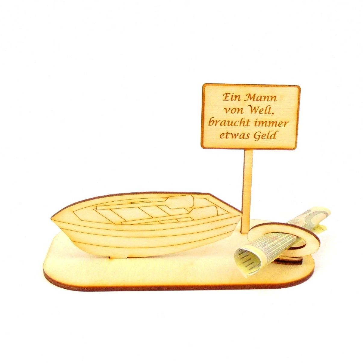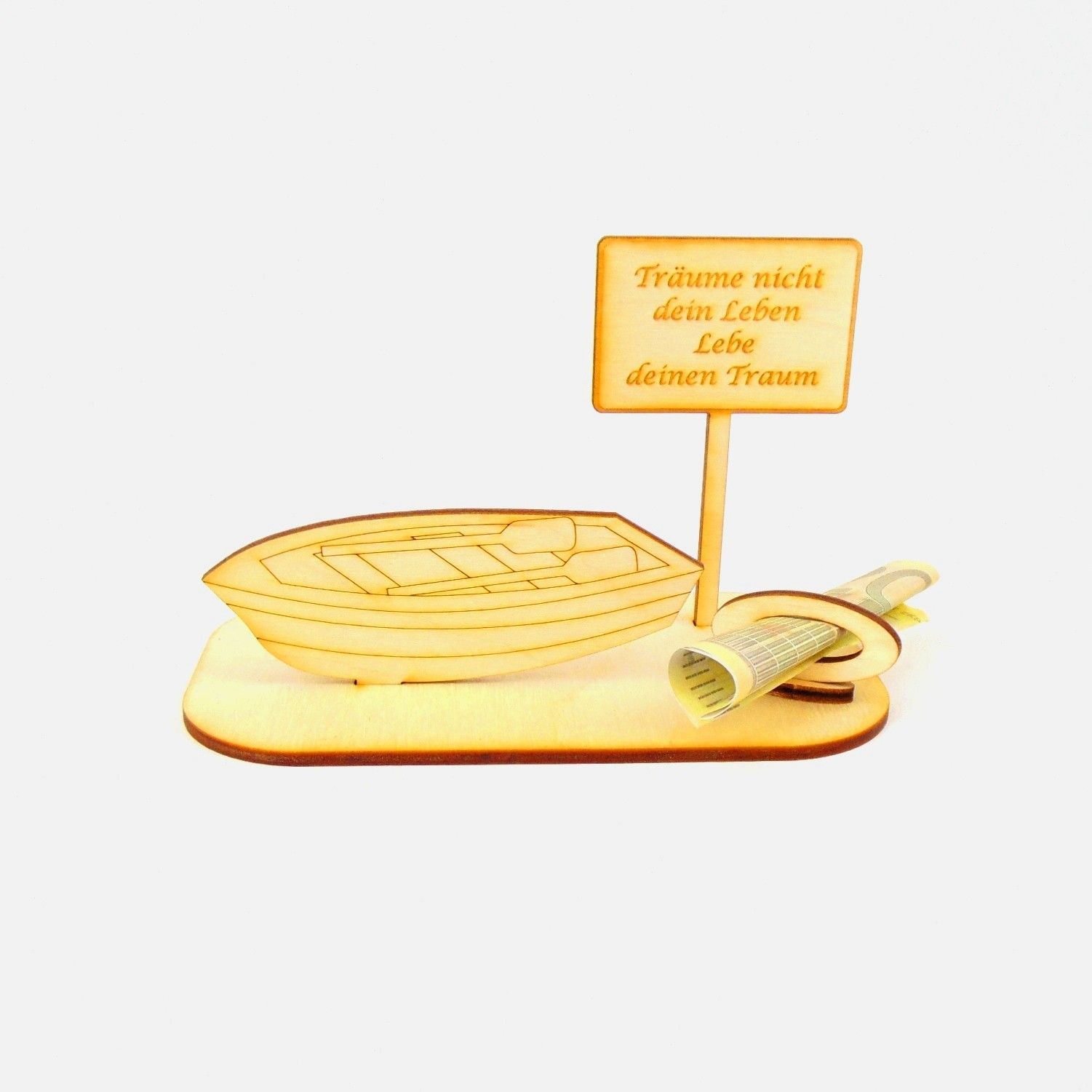 Ruderboot Personalisiert aus Birkenholz für Geldgeschenk und/oder Gutscheingeschenk zum Geburtstag Die Ortsschilder sind mit verschiedenen vorgegebenen Texten oder Sie teilen uns Ihre Wunschgravur mit. Sie erhalten 6 Teile aus 3 mm Birkenholz gelasert. Das Geldgeschenk besteht aus der Grundplatte 14cm x 8cm, einem Ruderboot 10cm x 4cm, einem Schild 5,5cm breit und 9cm hoch.