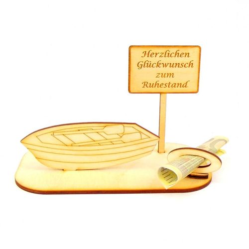 Ruderboot Personalisiert aus Birkenholz für Geldgeschenk und/oder Gutscheingeschenk zur Rente Die Ortsschilder sind mit verschiedenen vorgegebenen Texten oder Sie teilen uns Ihre Wunschgravur mit. Sie erhalten 6 Teile aus 3 mm Birkenholz gelasert. Das Geldgeschenk besteht aus der Grundplatte 14cm x 8cm, einem Ruderboot 10cm x 4cm, einem Schild 5,5cm breit und 9cm hoch.