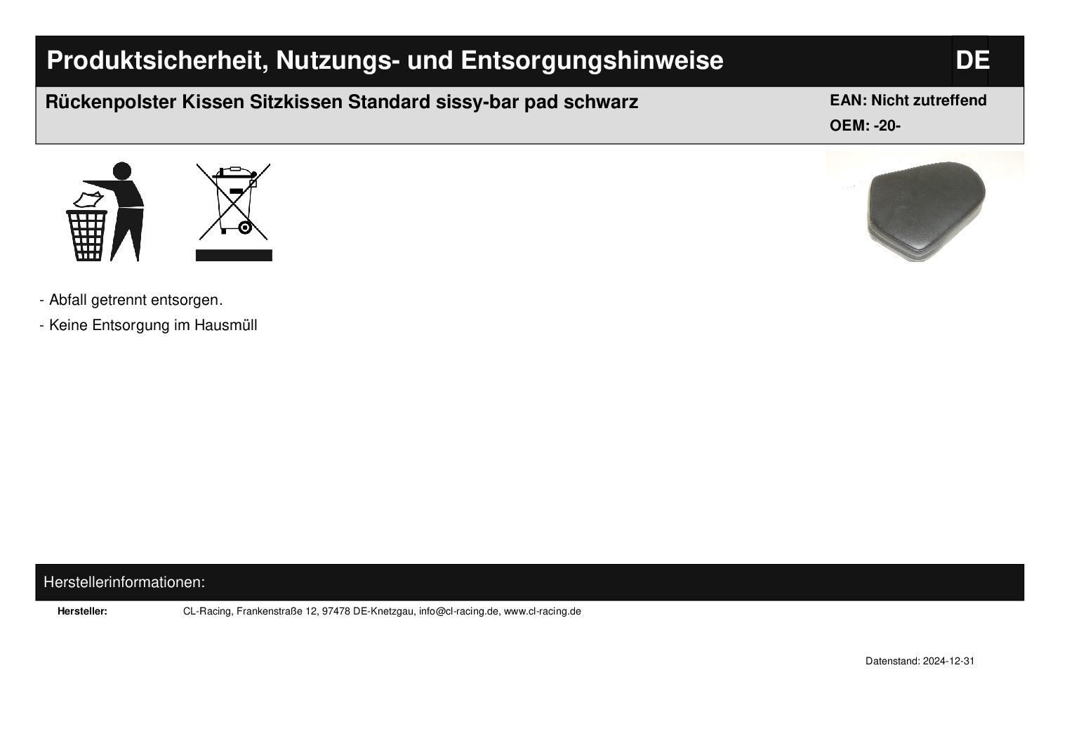 Rückenpolster Kissen Sitzkissen Standard sissy-bar pad schwarz
