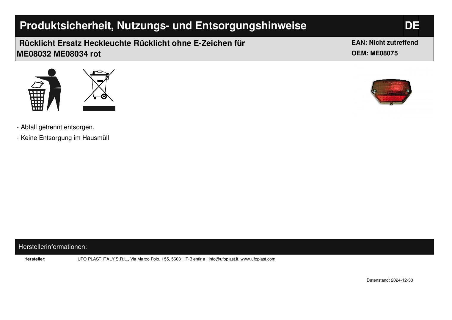 Rücklicht Ersatz Heckleuchte Rücklicht ohne E-Zeichen für ME08032 ME08034 rot