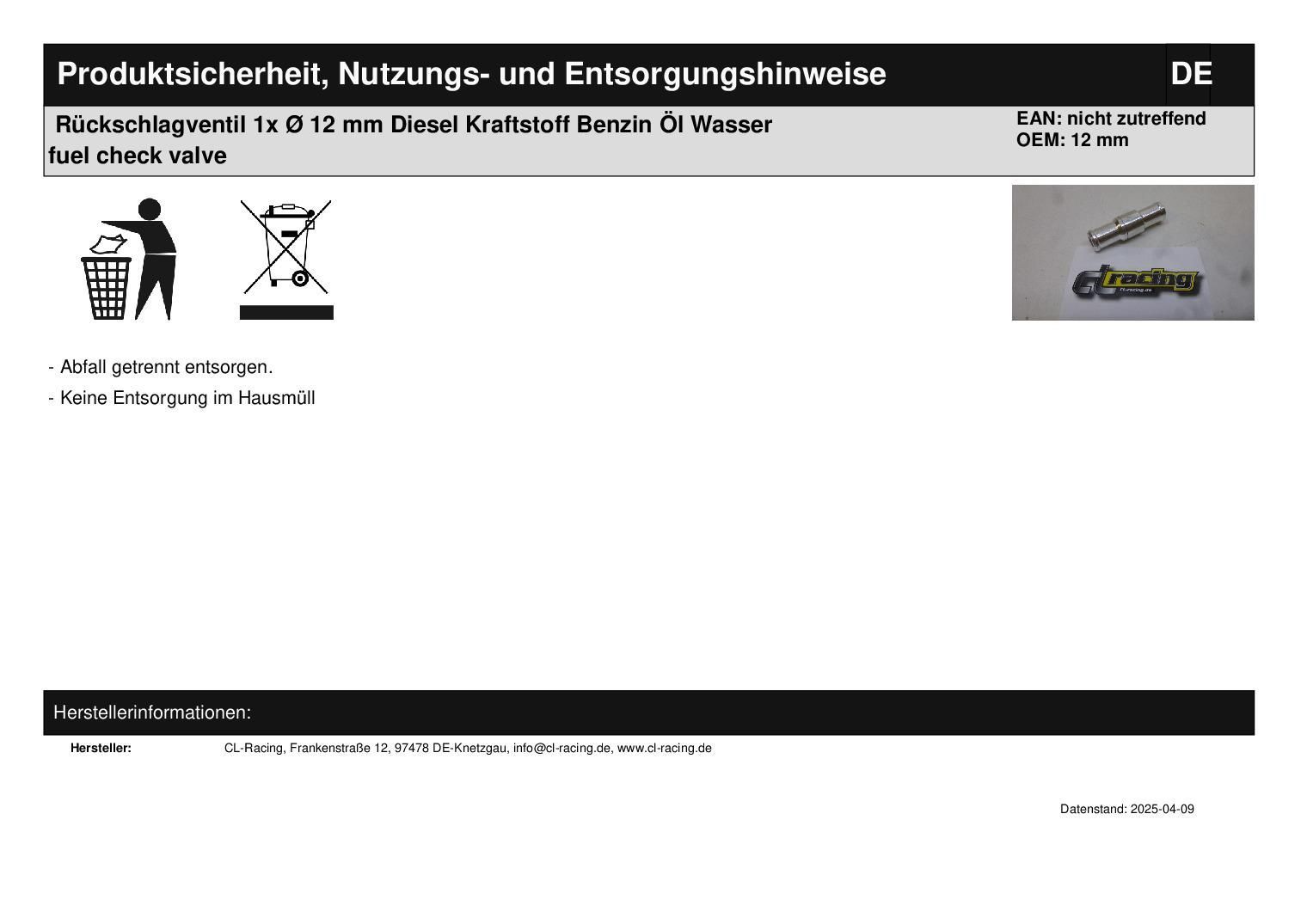 Rückschlagventil 1x Ø 12 mm Diesel Kraftstoff Benzin Öl Wasser fuel check valve