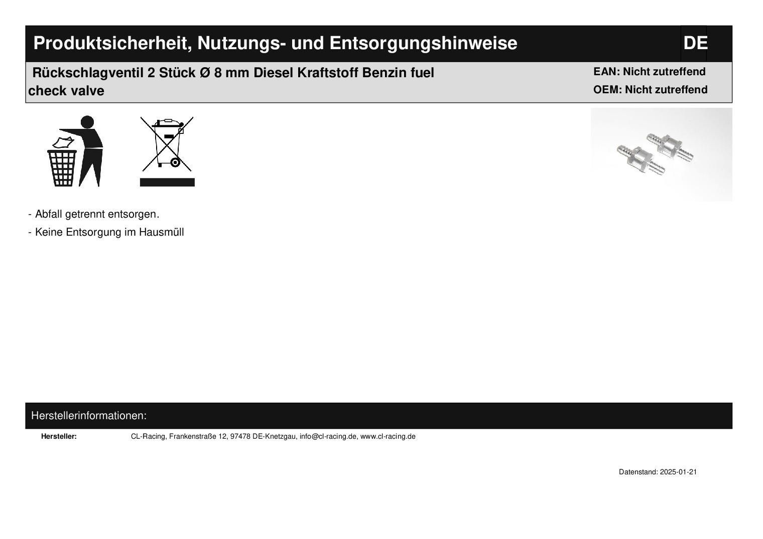 Rückschlagventil 2 Stück Ø 8 mm Diesel Kraftstoff Benzin fuel check valve