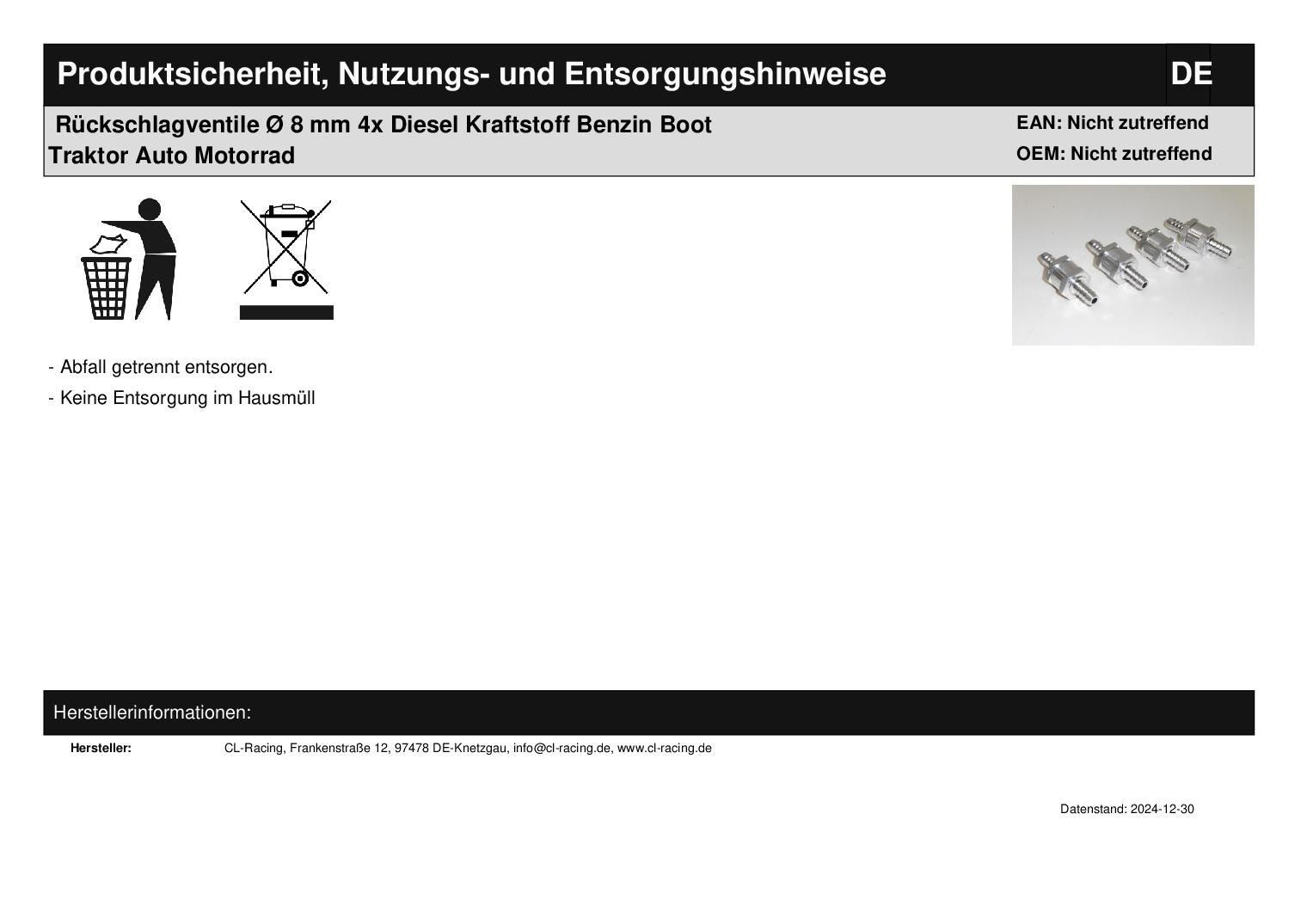 Rückschlagventile Ø 8 mm 4x Diesel Kraftstoff Benzin Boot Traktor Auto Motorrad